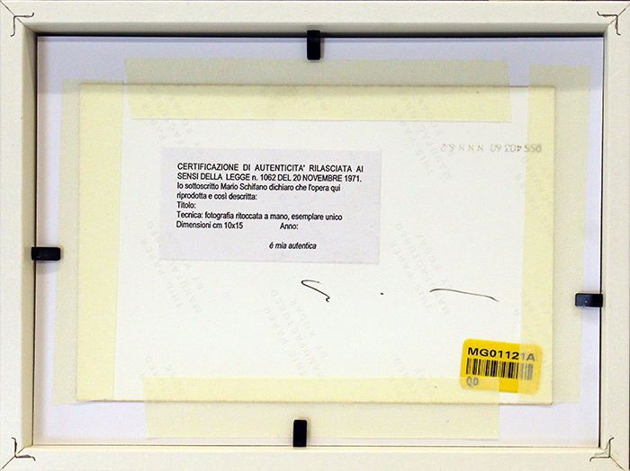 MARIO SCHIFANO, Senza titolo, 1990-1997, fotografia dipinta a mano, dim. 10x15 cm. Al verso: scheda descrittiva e firma dell'autore. Opera archiviata presso l'Archivio generale dell'Opera di Mario Schifano al N°F90-97/7414 in data 22/10/2007 a Roma. Opera pubblicata sul Catalogo Fondazione M.S Multistudio alla pag. 325 del volume V e sul Catalogo Fotografie Ritoccate alla pag. 158 del volume I. Opera con cornice
