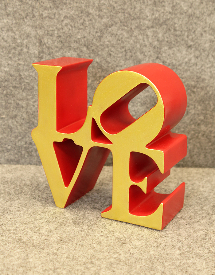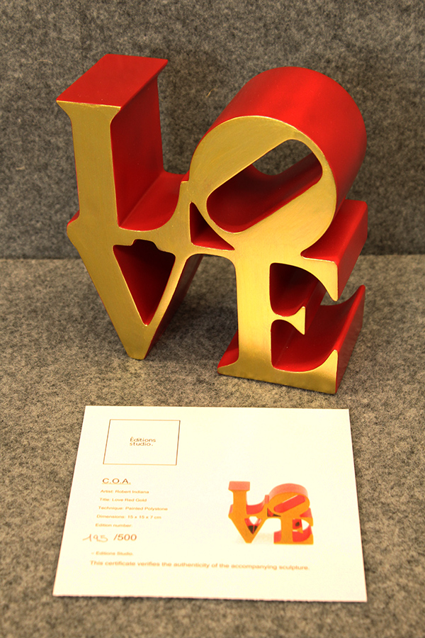 ROBERT INDIANA, "Love Red Gold", anni 2000, polistone dipinto, cm 15x15x7, tiratura 195/500. Opera con certificato di autenticità di E'dition Studio. Al verso: tiratura in basso a destra. Opera venduta con il suo contenitore personalizzato. Opera con certificato di provenienza della Daliano Ribani Arte.