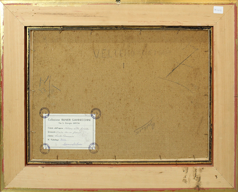 CARLO DOMENICI, "Veliero alla Fonda", anni '50, olio su faesite, 35x50 cm, con cornice 53x67x6 cm, 3,35 kg. Al fronte: firma in basso a destra. Al verso: Etichetta Collezione Ranieri Giannecchini con timbri in alto a sinistra, titolo in alto. Opera con cornice.