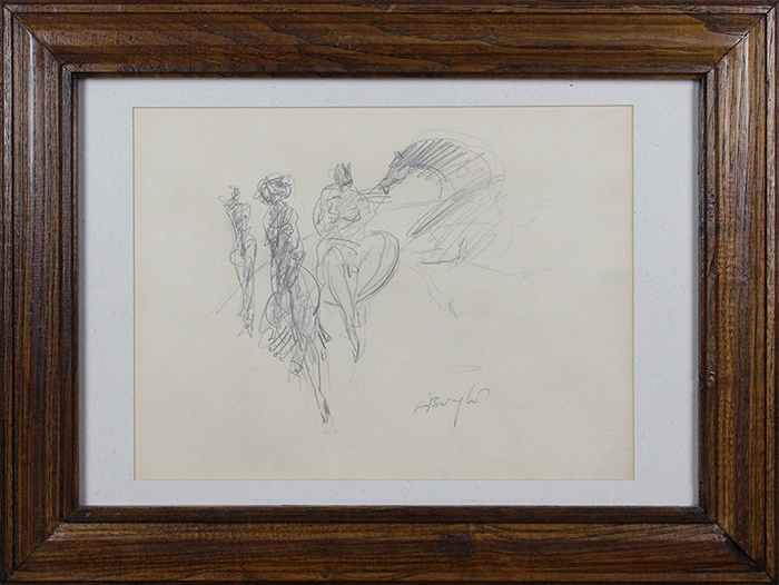 ALFONSO BORGHI, "Amazzoni", 1985, Disegno a matita su carta, Dim. 40x32, Opera accompagnata da autentica dell' Artista su foto, Al fronte: firmato in basso al centro