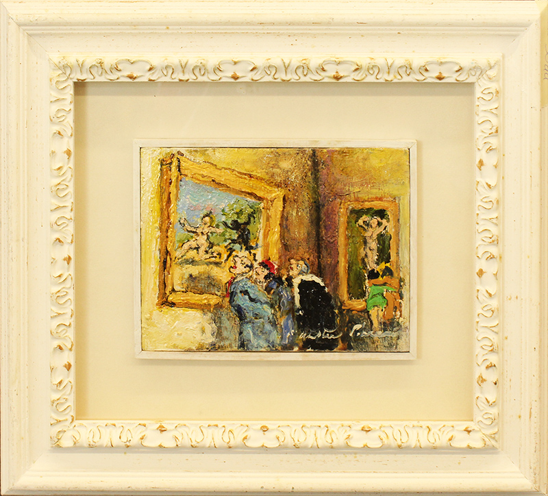 WALTER PIACESI, "Guardoni", anni 2000, olio su tavola, cm 13x18, con cornice 32x37x3 cm, peso 1 kg. Al fronte: firma in basso a destra. Al verso: firma, titolo, tecnica, misure, numero d'archivio. Opera con certificato di provenienza della Daliano Ribani Arte. Opera con cornice in omaggio.