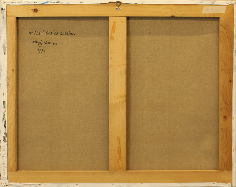 KUNEN ALEYIS, "Sur la colline", 1974, acrilico su tela, 80x100x2 cm, peso 2 kg. Al fronte: firma e anno in basso a sinistra. Al verso: in alto a sinistra titolo, firma, anno, numero (126). Opera con certificato di provenienza della Daliano Ribani Arte. Opera senza cornice. L'opera non è in perfette condizioni, presenta difetti.