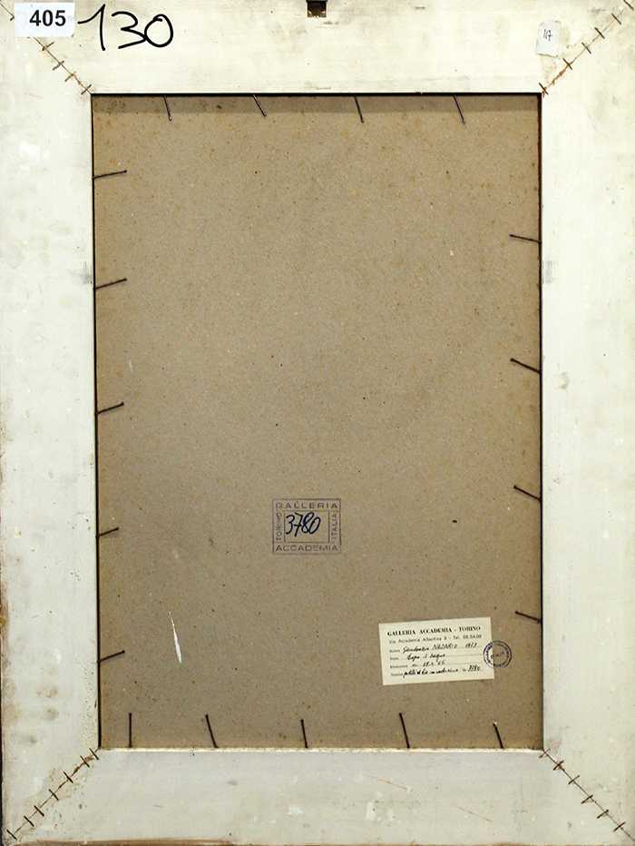 GAUDENZIO NAZARIO, "Dopo il bagno", anni '1973, olio e pastelli su cartoncino, dim 55x38 cm. Al fronte: firma in basso a destra. Al verso: timbro della Galleria Accademia al centro e in basso etichetta della Galleria Accademia con informazioni. Opera con cornice.