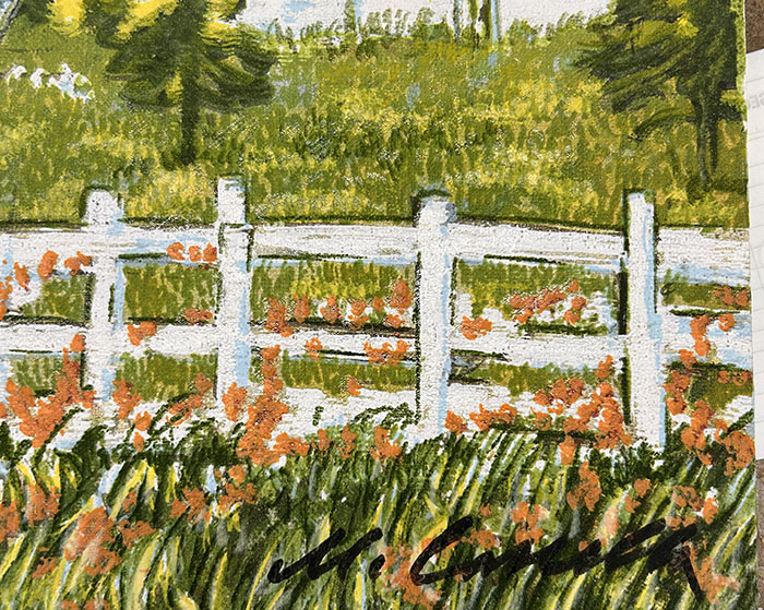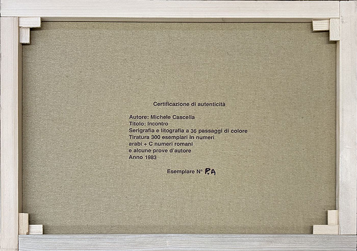 Michele Cascella, "Incontro", 1983, serigrafia e litografia a 36 passaggi di colore, tiratura a 300 esemplari in numeri arabi + C numeri romani e alcune prove d'autore. Tiratura P.A. Il colore della tiratura al retro traspare leggermente sul fronte. Opera senza cornice