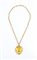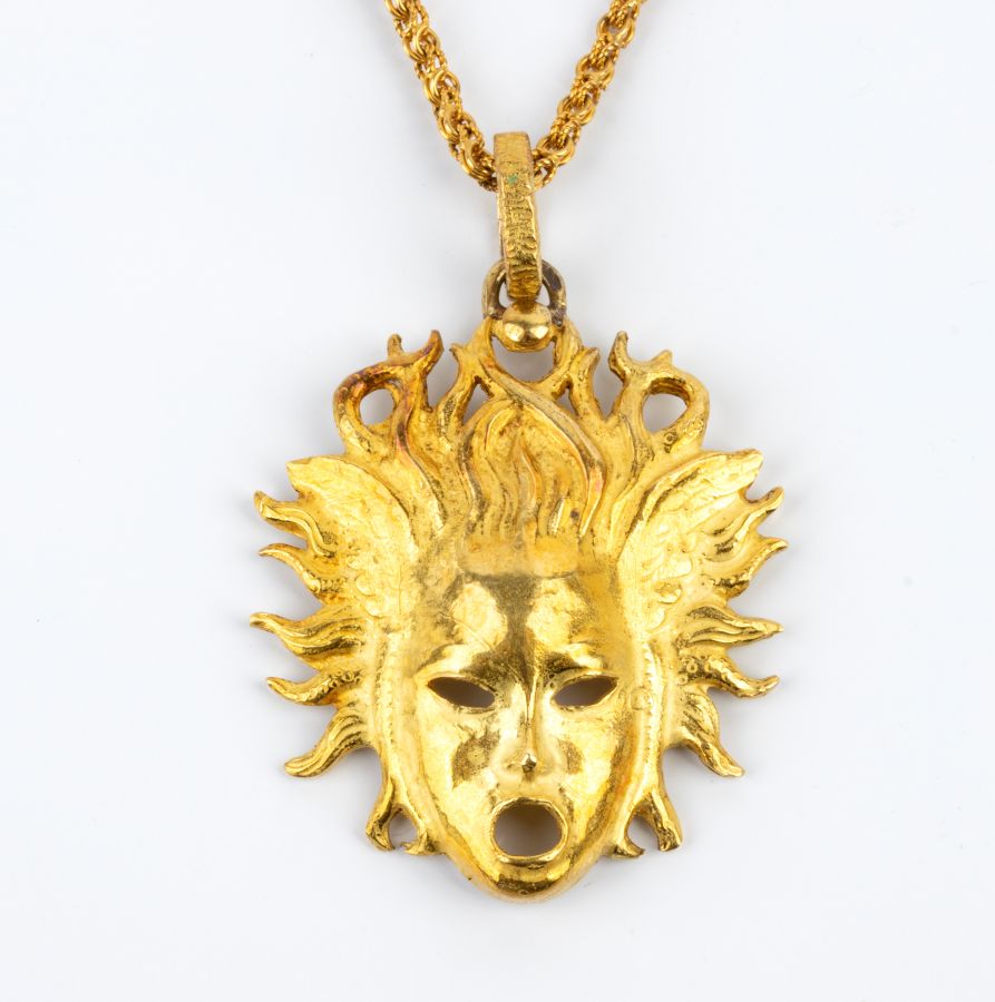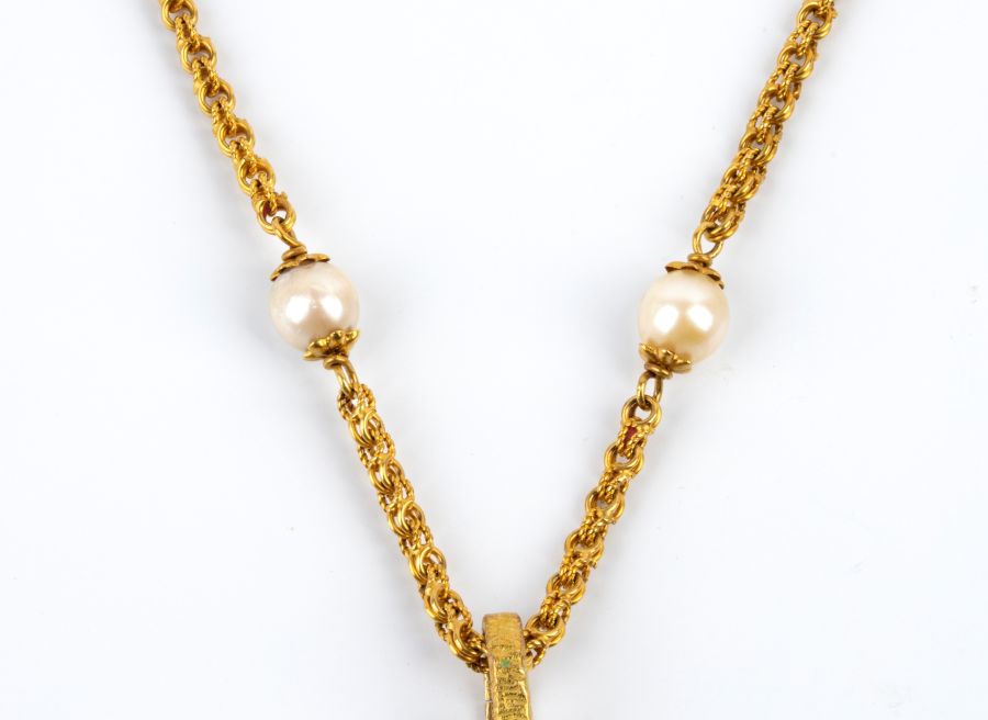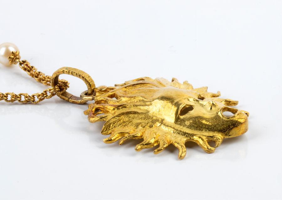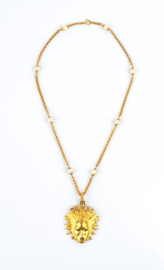 in oro giallo 18k, con catena in piccole maglie ad anello interrotta da perle coltivate d'acqua salata, a cui è sospeso un pendente raffigurante una maschera femminile.