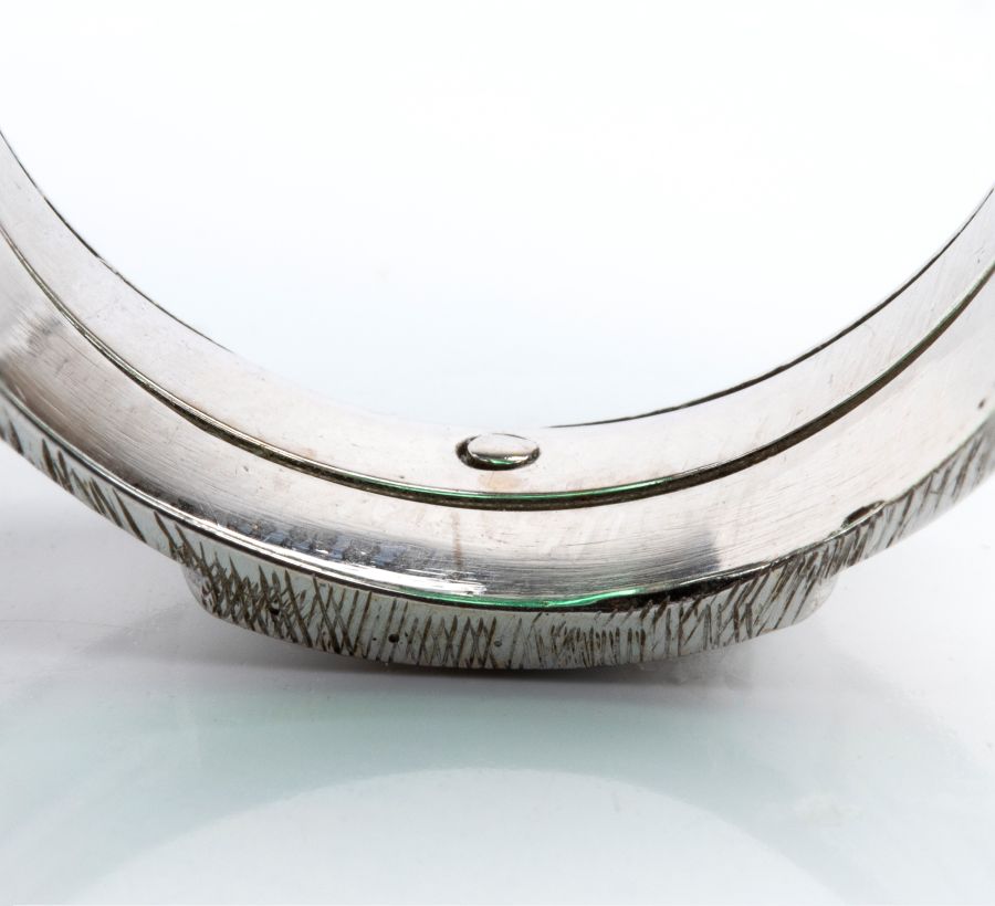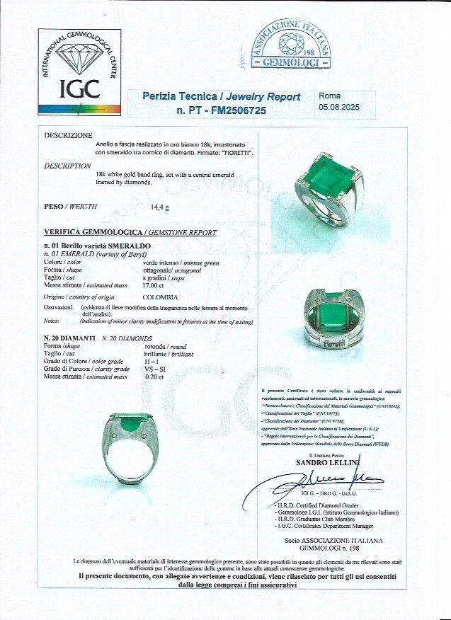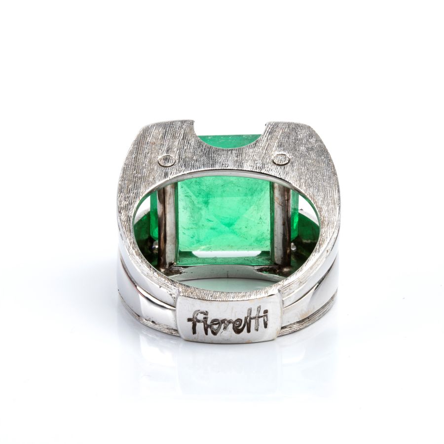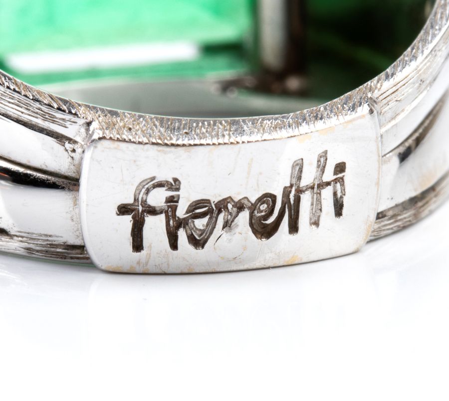 modellato come una fascia, a fascia, incastonato con smeraldo tra cornice di diamanti. Firmato "FIORETTI".