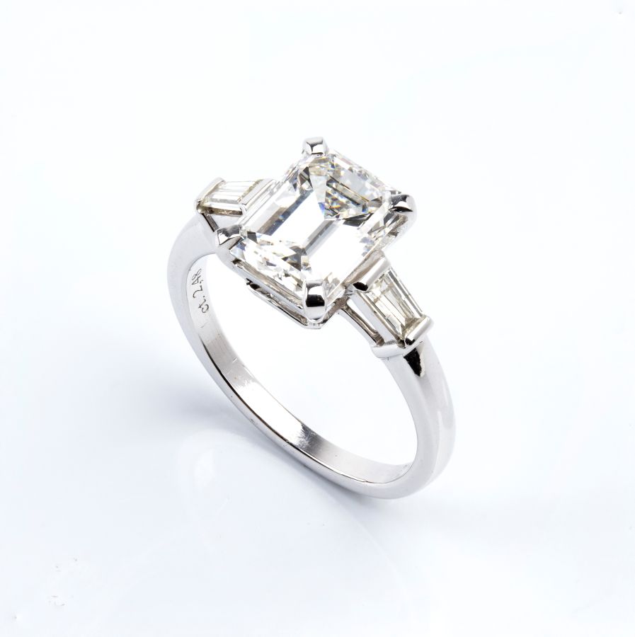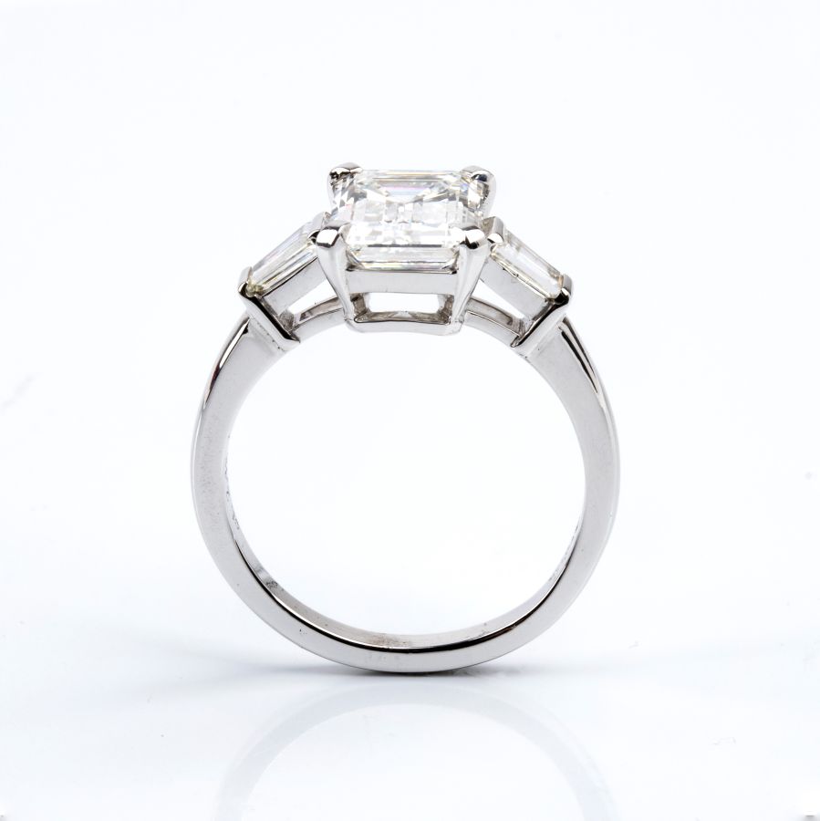 N. 01 diamante di forma ottagonale, taglio a gradini, stimato per un peso totale di circa 2.48 ct, colore F-G, purezza VVS e coppia di diamanti di forma trapezoidale, taglio tapered, stimati per un peso totale di circa 0.40 ct, colore G-H, purezza VS-SI, VS, come misurati e classificati nella montatura.