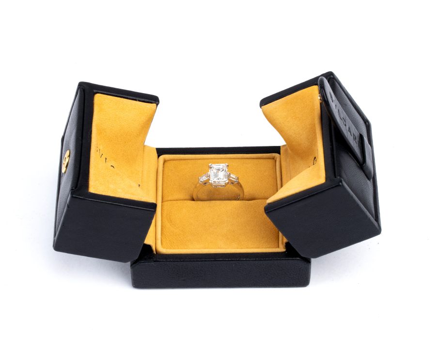 montatura in oro bianco 18k, incastonato con diamante centrale ottagonale affiancato da coppia di diamanti tapered. Firmato BULGARI. Accompagnato da scatola originale.