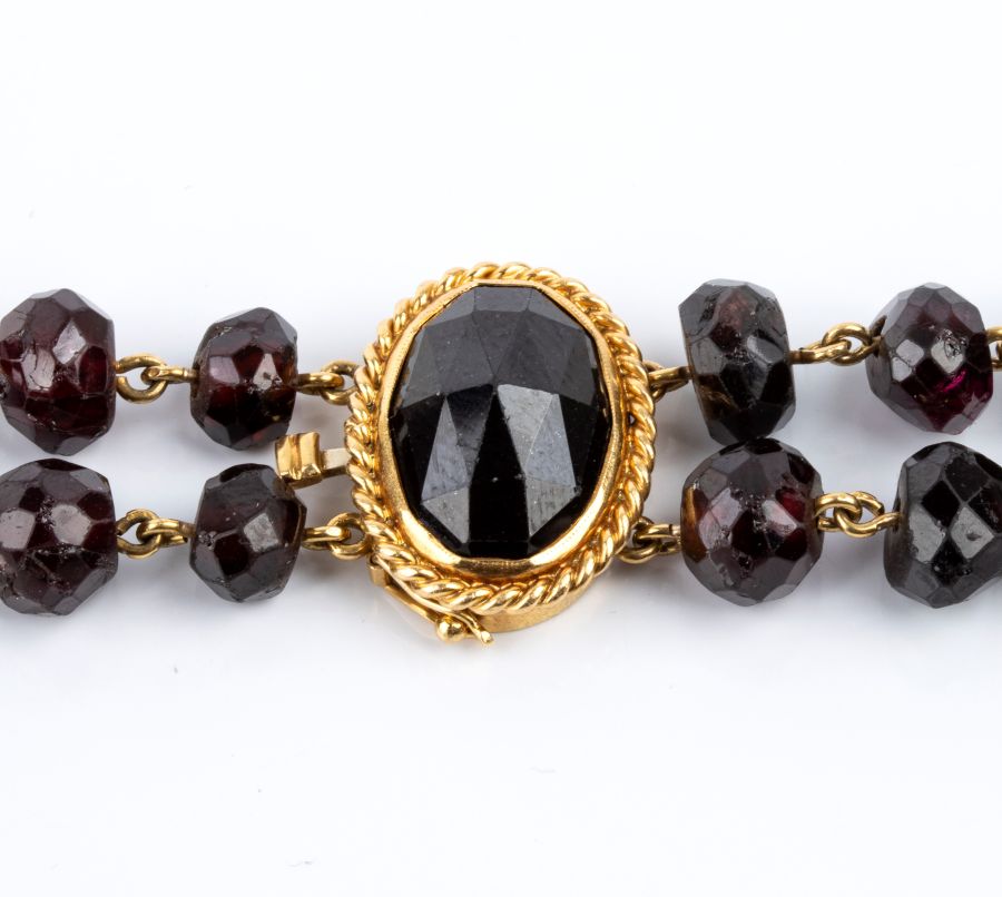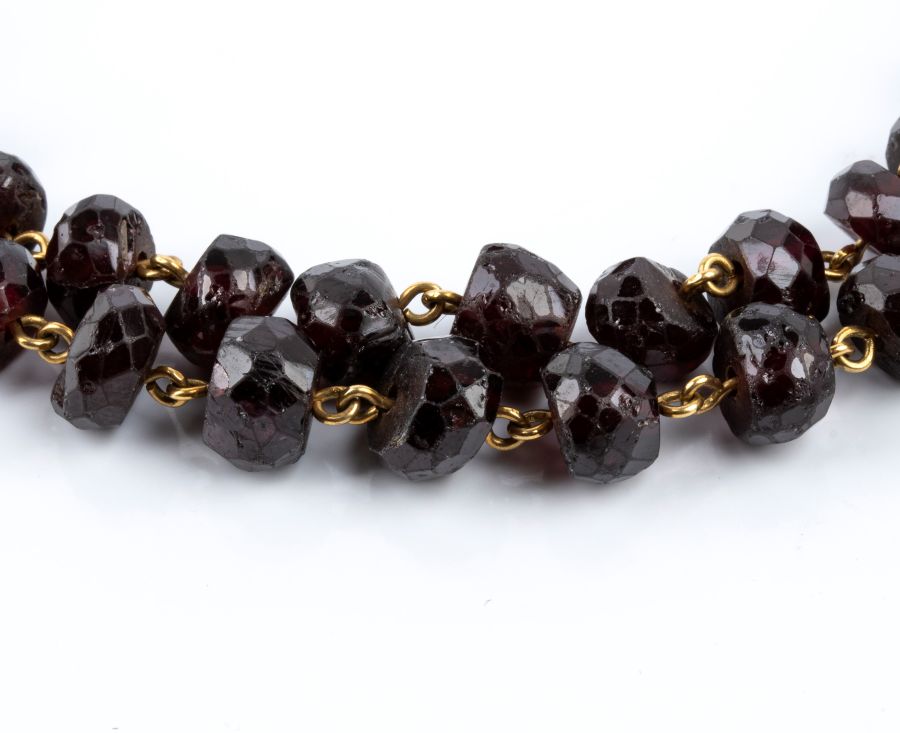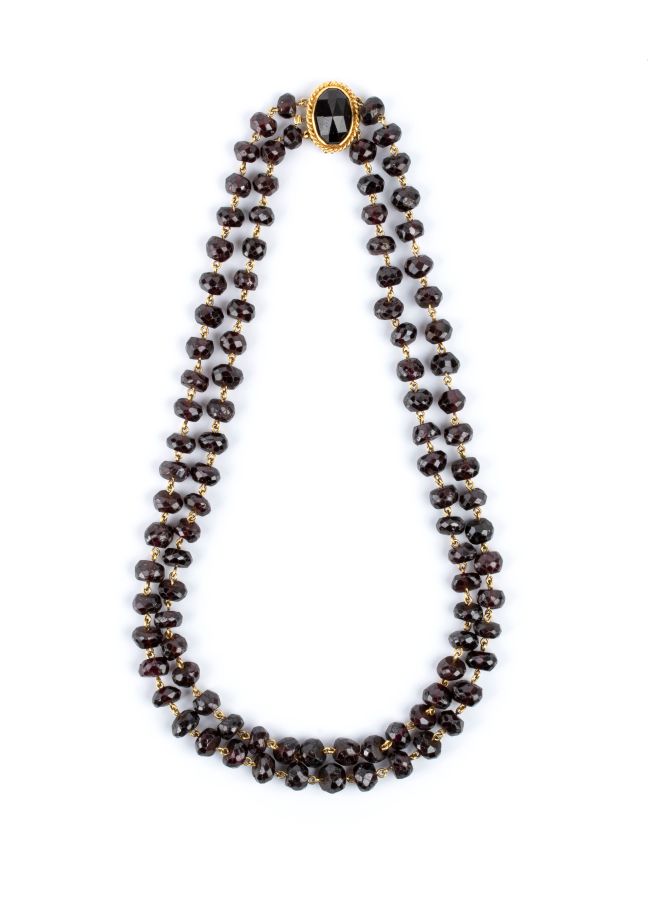 a due fili di sfere sfaccettate di granato, fermezza e montaggio in oro giallo.