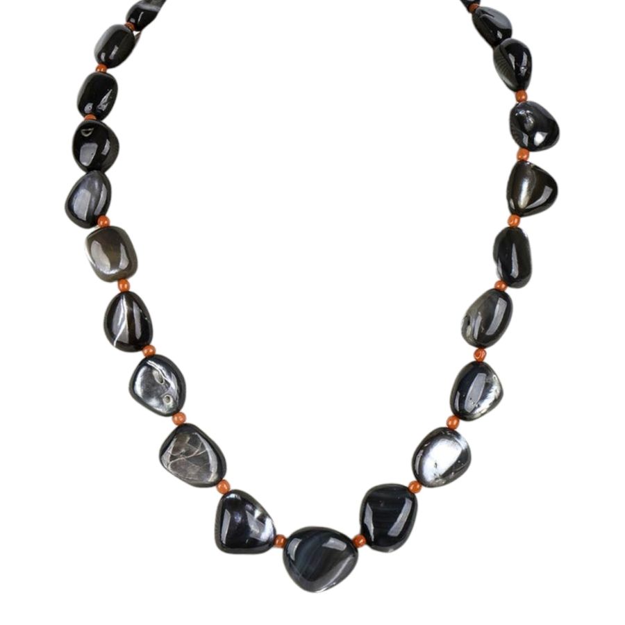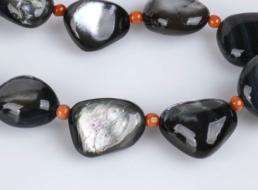 oro giallo 18k, ad un filo di ciottolo di madreperla di pinctada Fucata separati da piccole sfere di corallo Mediterraneo (corallium rubrum) disposti in gradazione.