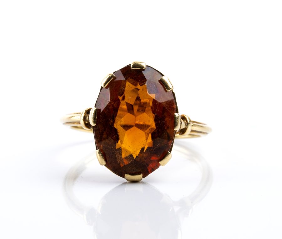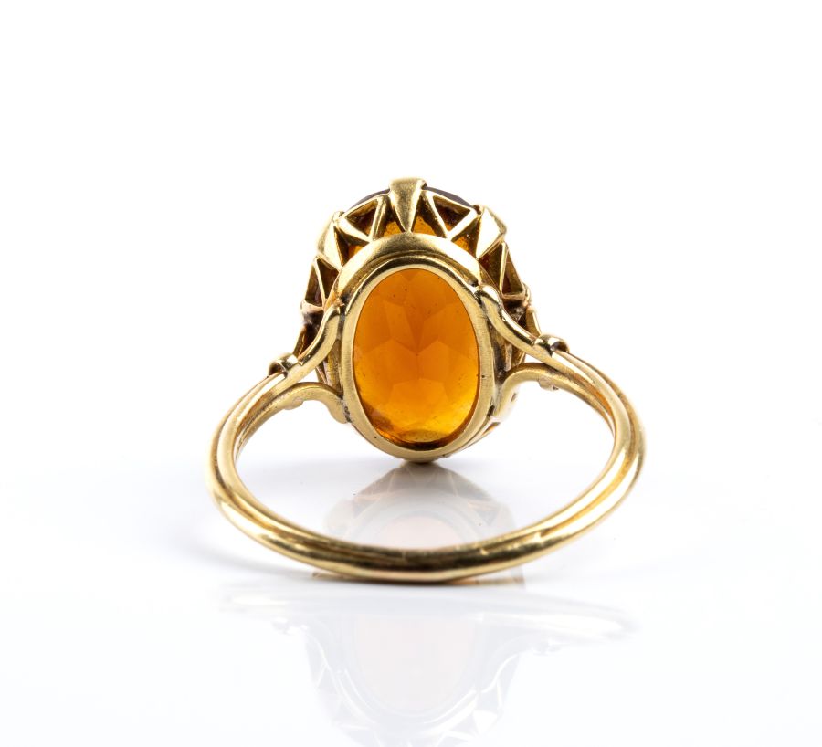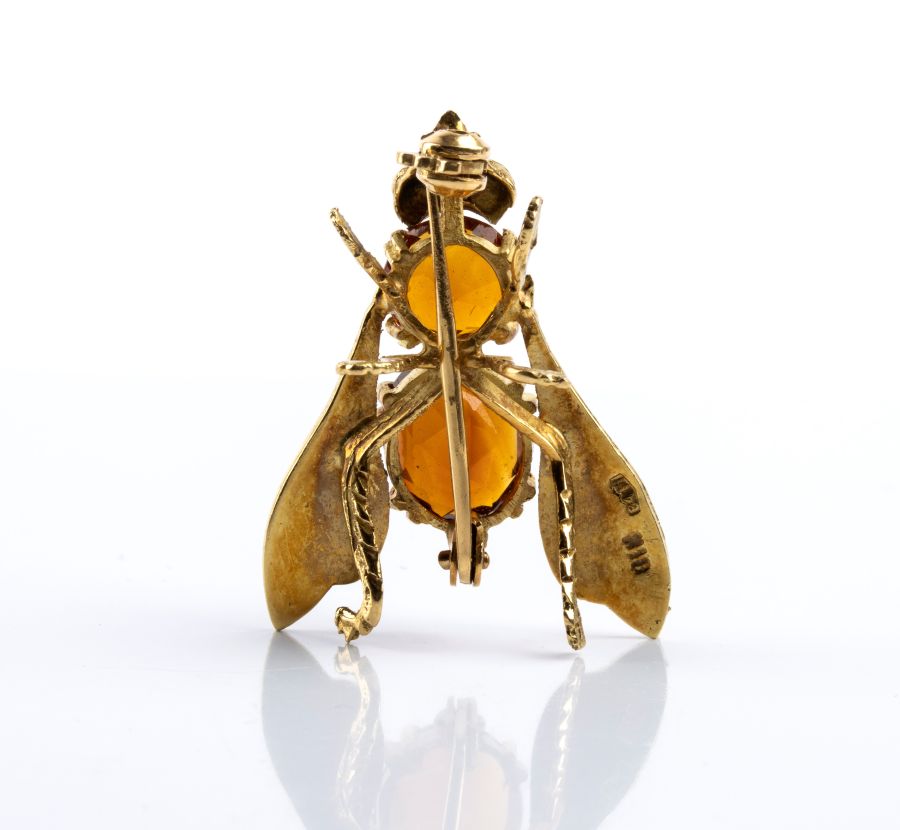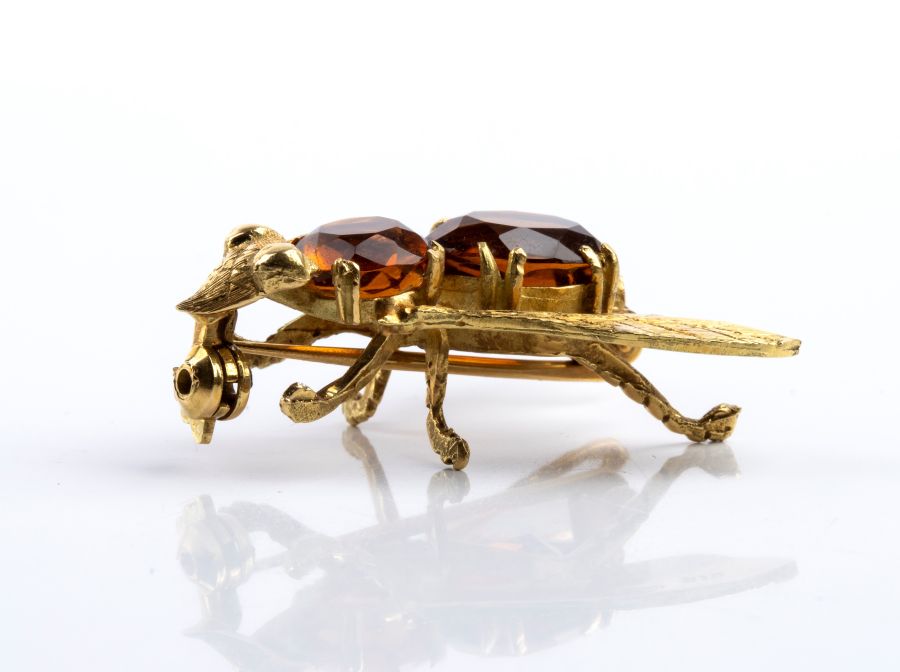 lotto composto da: un anello incastonato con quarzo citrino ovale; una spilla raffigurante un insetto incastonata con coppia di quarzi citrini.