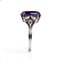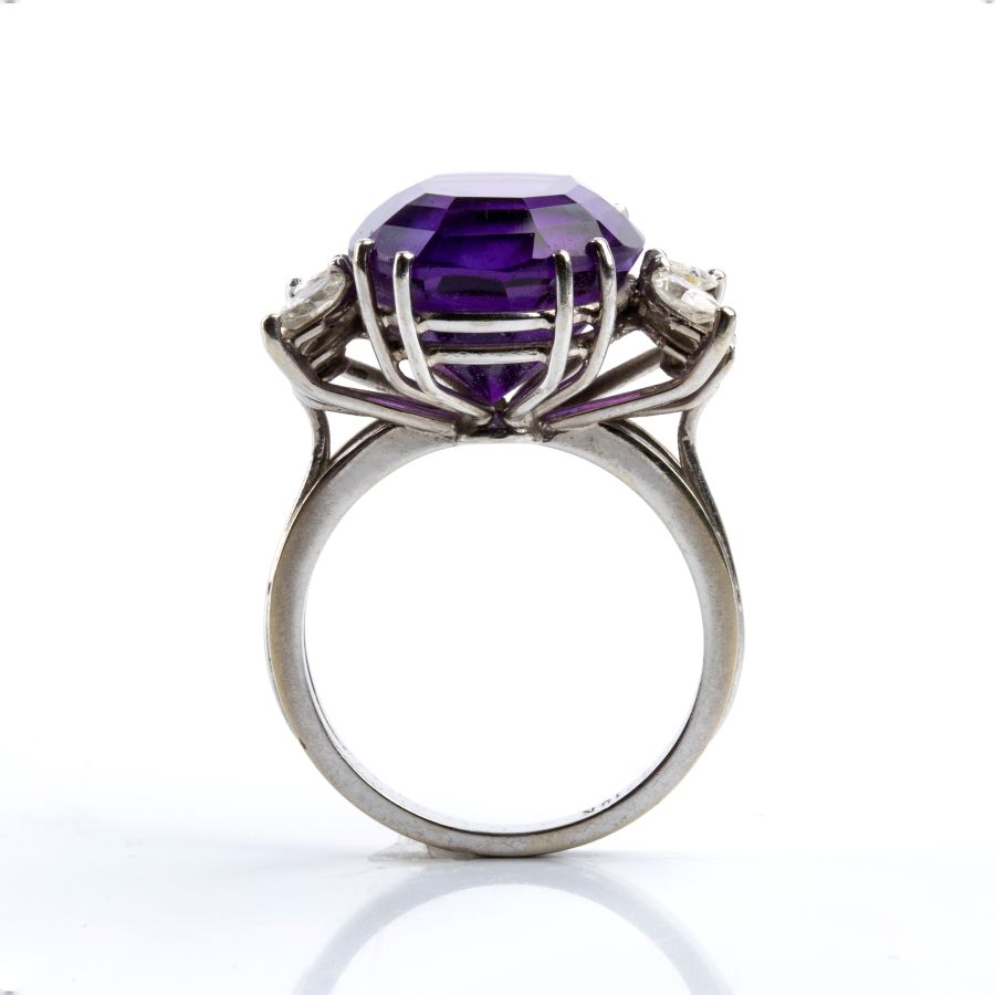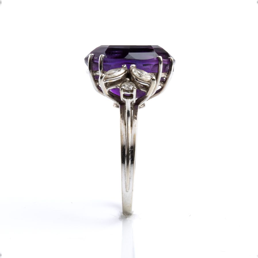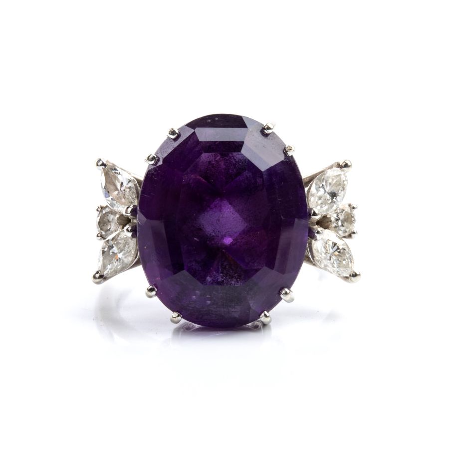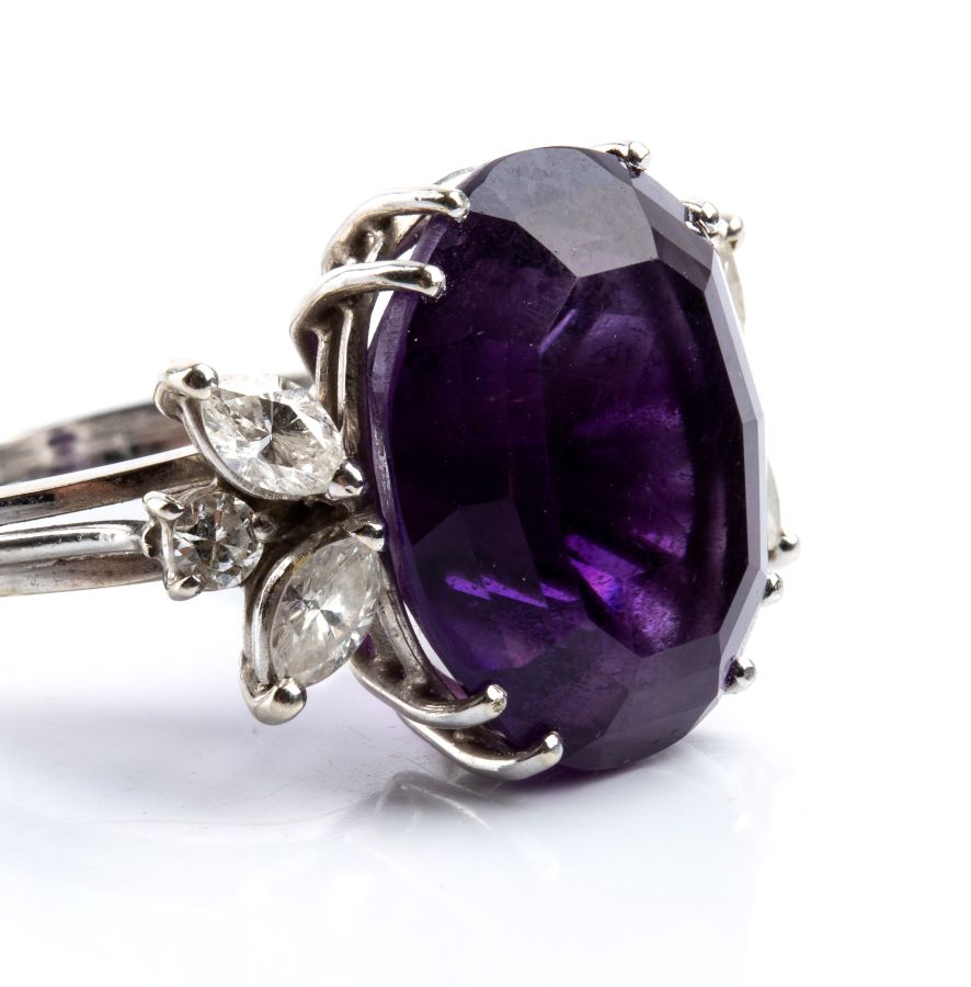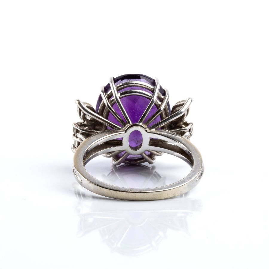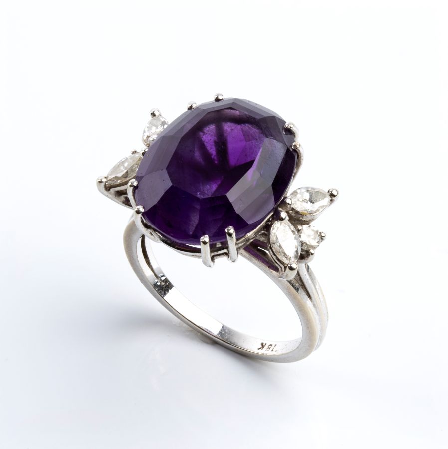 in oro bianco 18k, impreziosito da ametista centrale di forma ovale e n. 06 diamanti di forma rotonda e forma a navetta, taglio brillante e taglio brillante modificato, circa 0.40 ct.