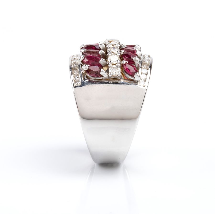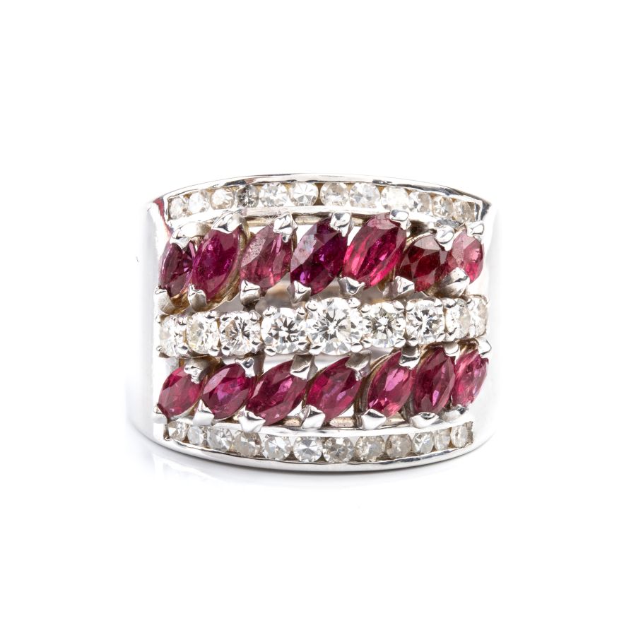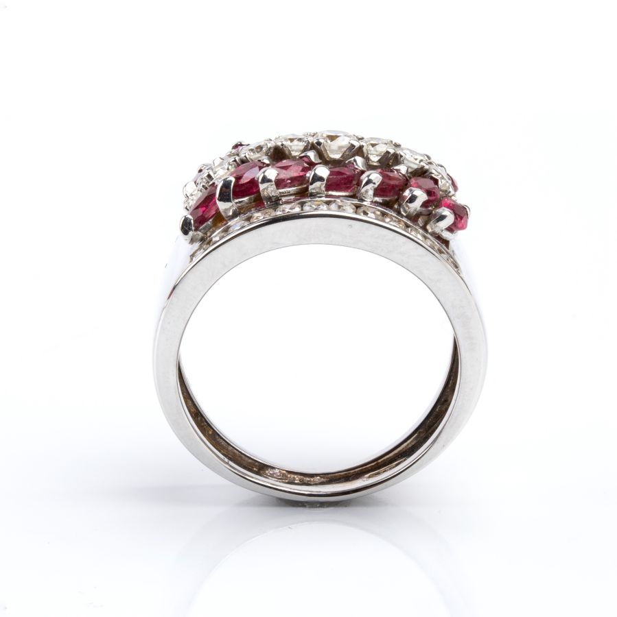 oro bianco 18k, incastonato con una fila di diamanti profilata da due file di rubini.
