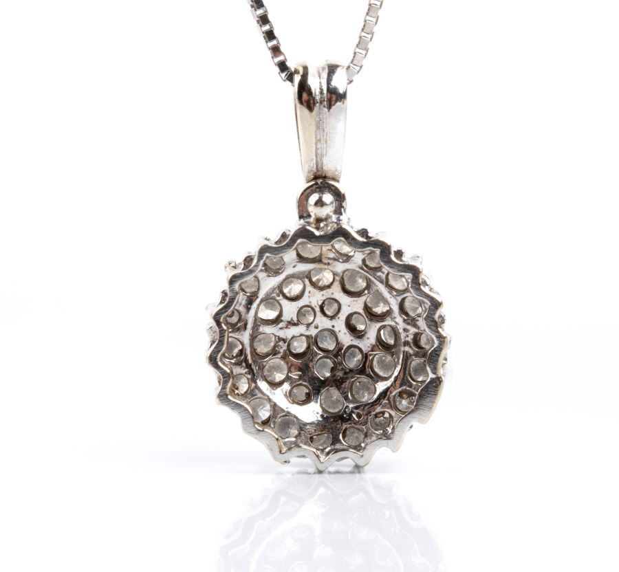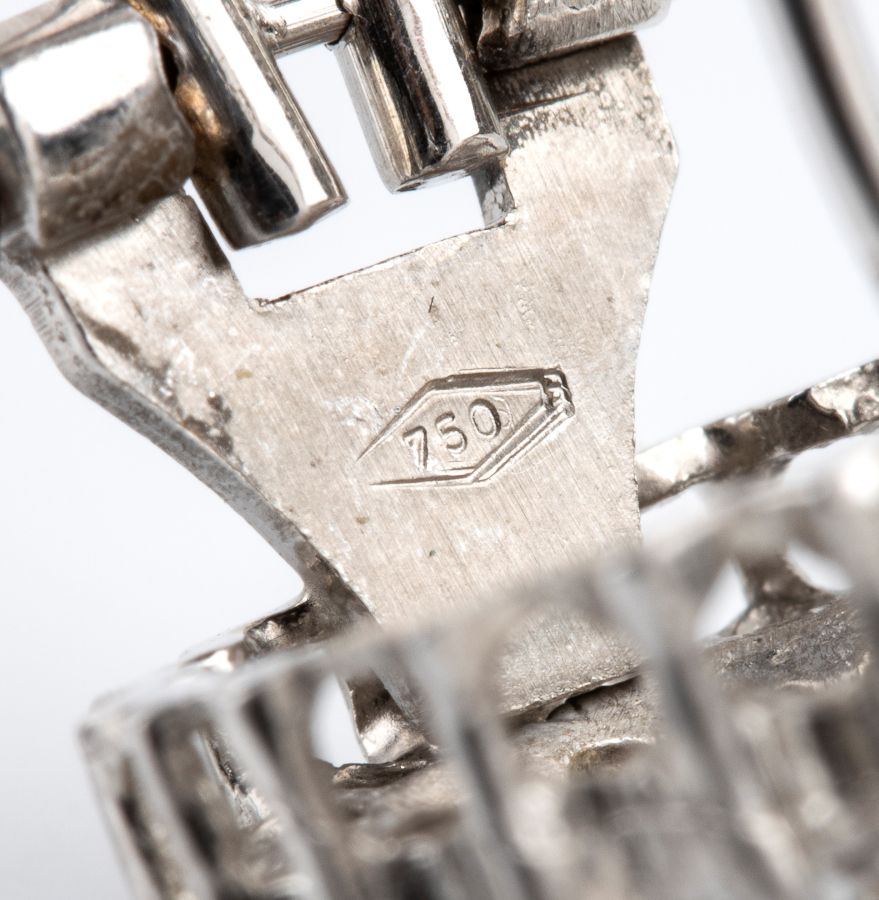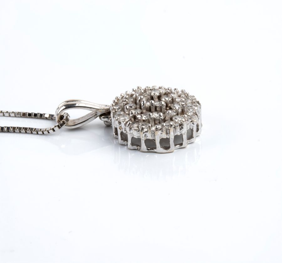 Punzonati "750 - 944 VI". Diametro orecchini e pendente: 1,3 cm. Peso complessivo: 12 gr.