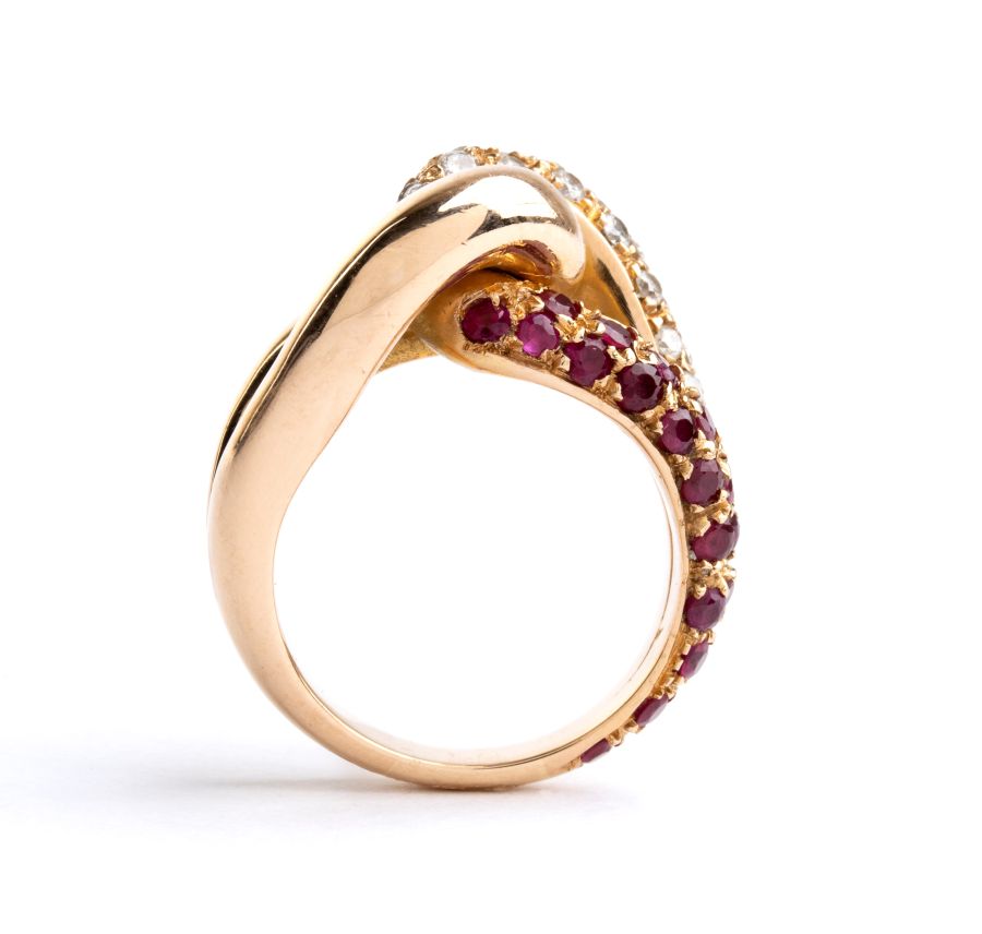 in oro rosa a motivo di nodo marinaio, impreziosito da pavè di diamanti e rubini.