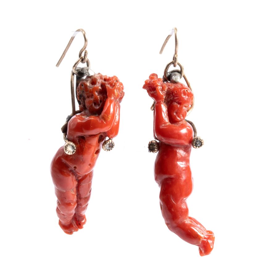 Orecchini in oro e corallo Mediterraneo a forma di putti Fine XIX secolo
