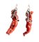 con montatura in oro a basso titolo, ciascuno con figura di putto danzante colto a tre quarti, scolpito in corallo Mediterraneo (corallium rubrum) impreziosito da coppia di diamanti taglio a rosa.