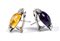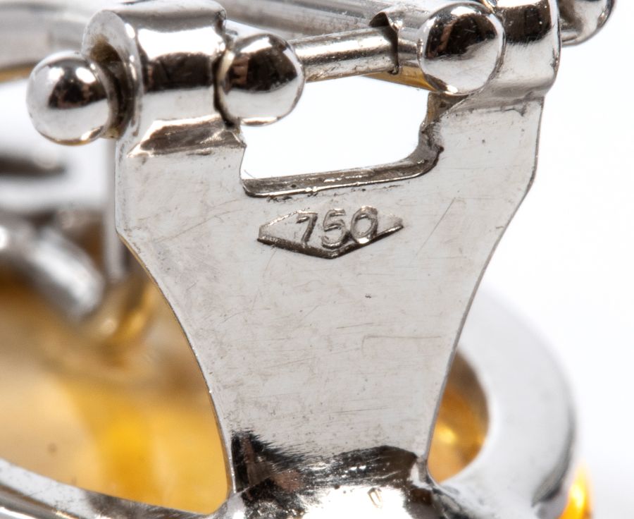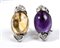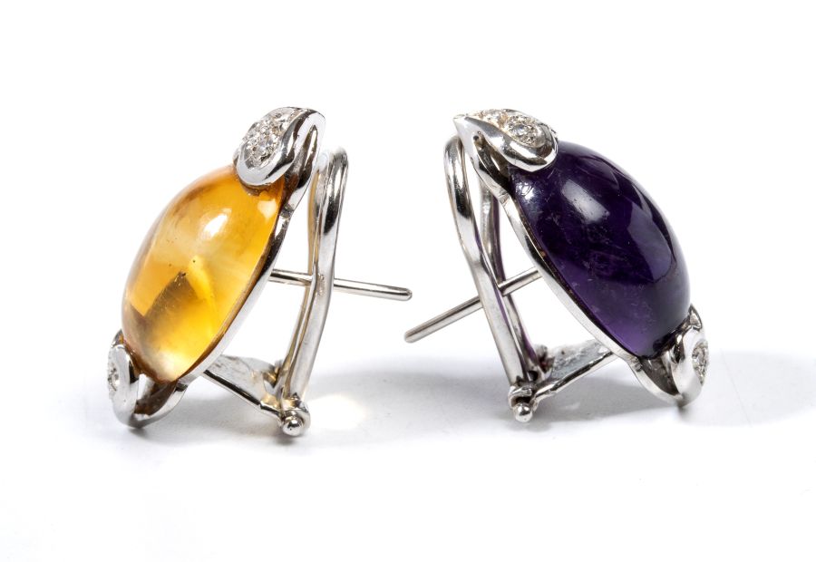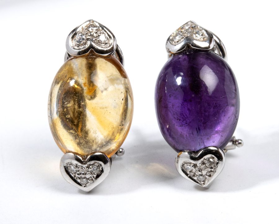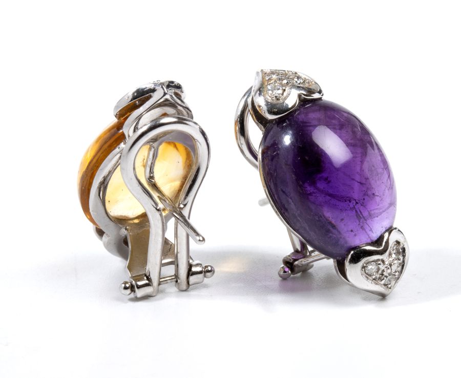 oro bianco 18k, ciascuno con perno e clip, impreziositi da due cabochon rispettivamente di ametista e quarzo citrino, dettagli in piccoli cuori con diamanti.