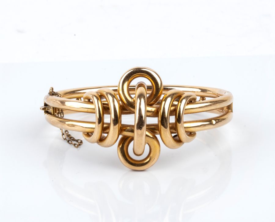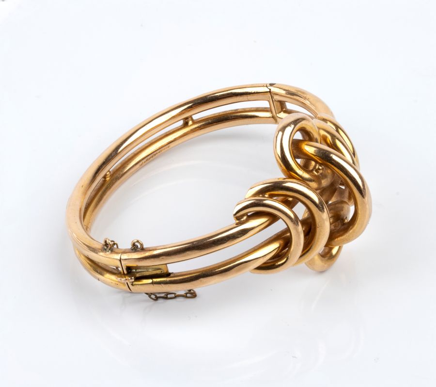 il gioiello è composto da una doppia fascia tubolare divisa e intrecciata sul davanti a formare un grande nodo. Il motivo sembra richiamare il "nodo d'amore", molto utilizzato in epoca Vittoriana, scambiato tra gli affetti in segno di lealtà e amore.