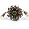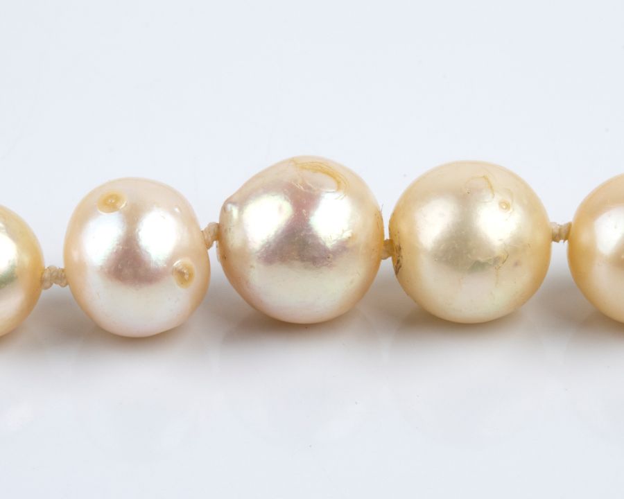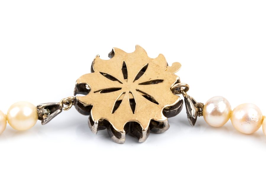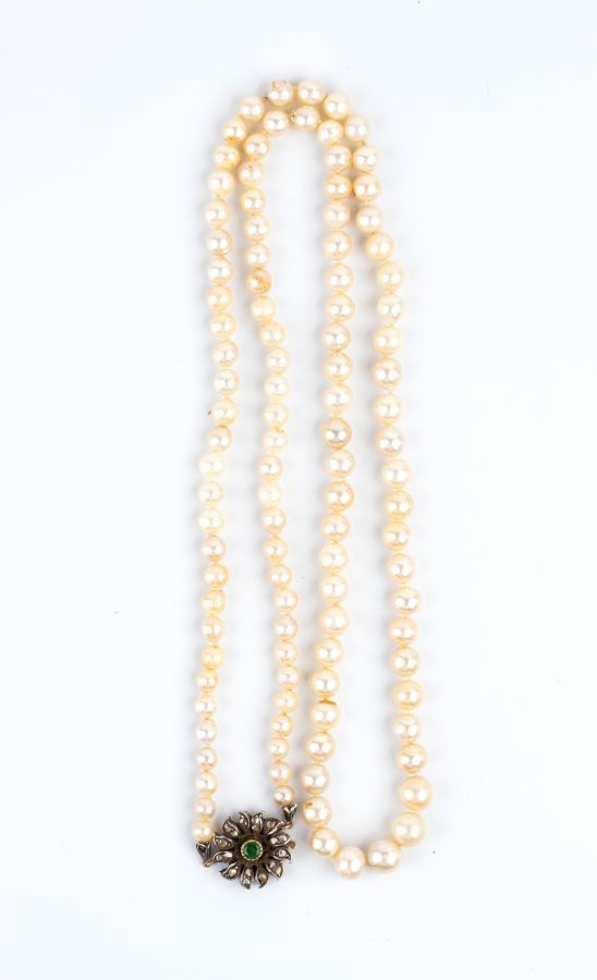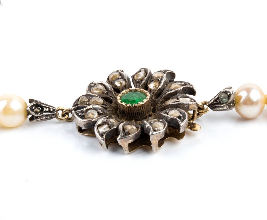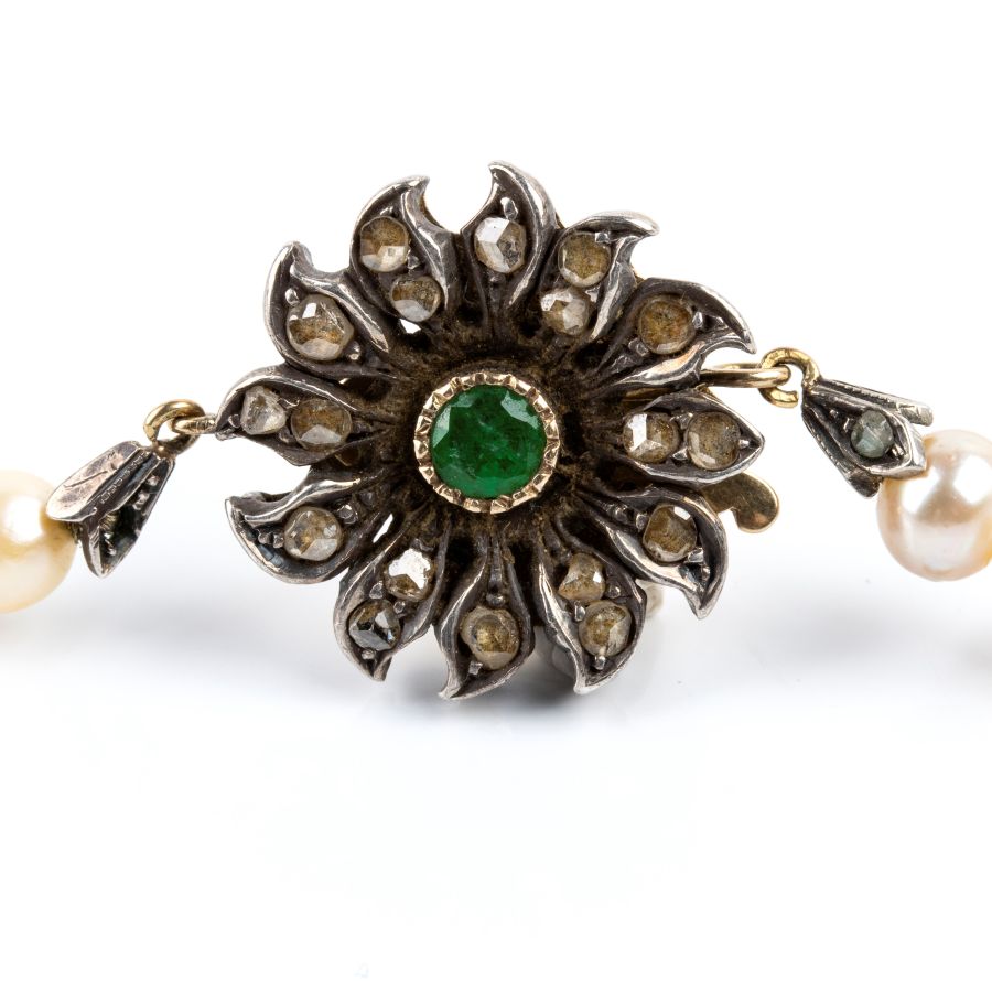 ad un filo di perle coltivate d'acqua salata disposte in gradazione, con fermezza a fiore in oro giallo ed argento incastonata con smeraldo e diamanti taglio a rosa.
