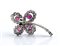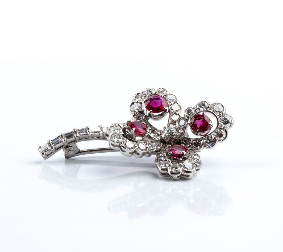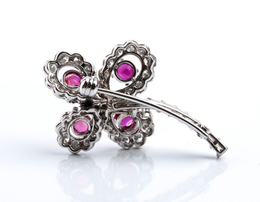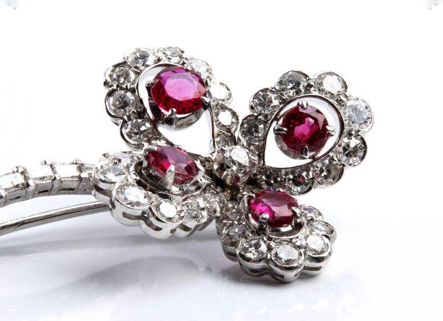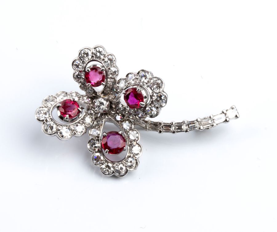 oro bianco 18k, con motivo di quadrifoglio in diamanti taglio baguette e huit-huit, stimati per un peso totale di circa 1.55 ct, colore G-H, purezza VVS-VS e rubini di forma rotonda, per un peso totale di circa 1.00 ct, come misurati e classificati nella montatura.