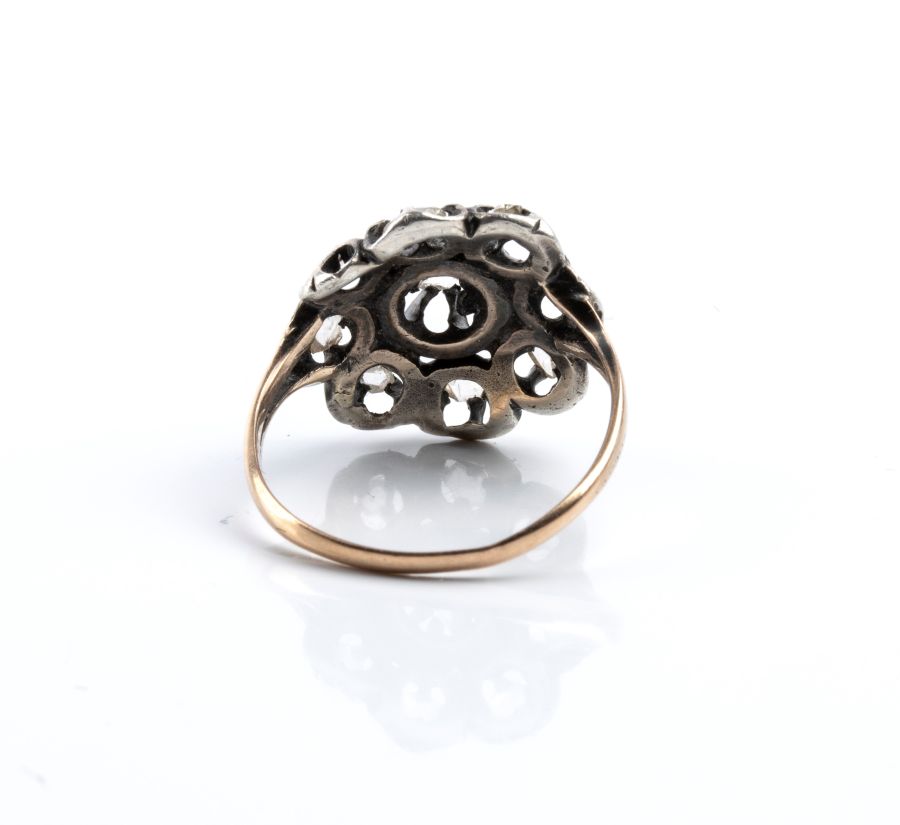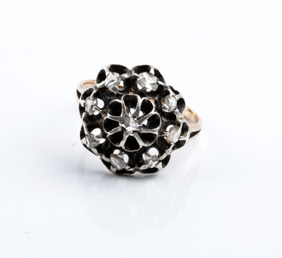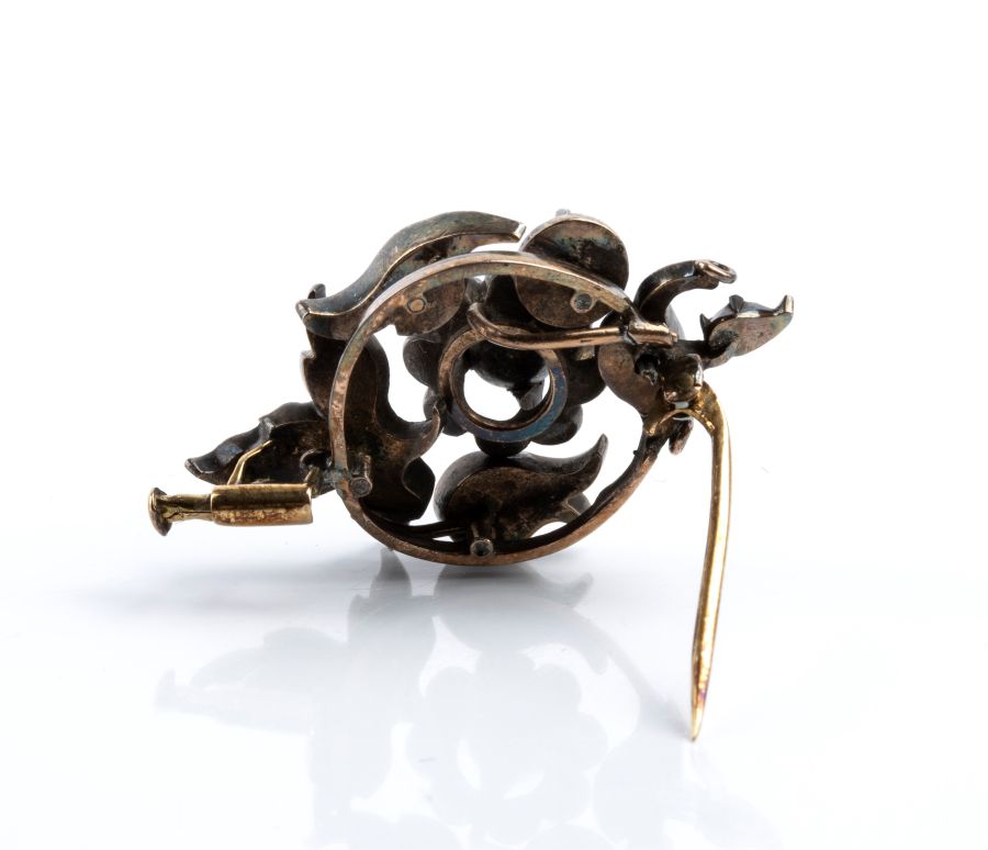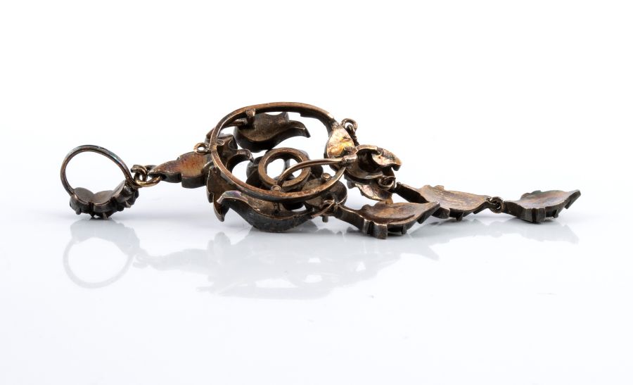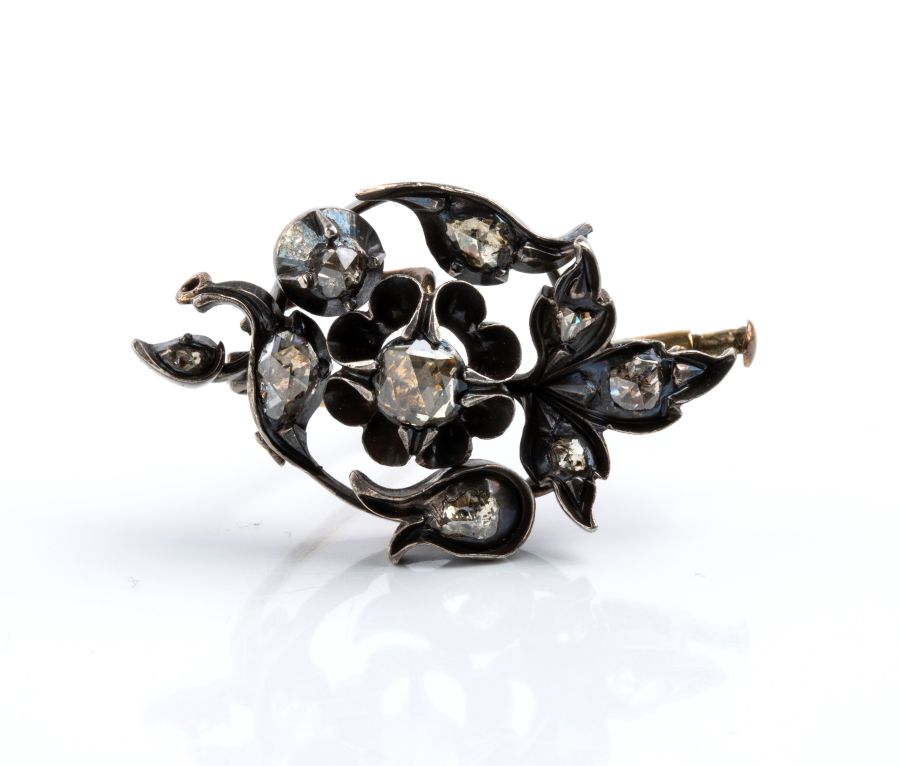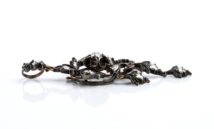composta da spilla, anello e pendente a motivi vegetali in oro ed argento, con diamanti taglio a rosa.
