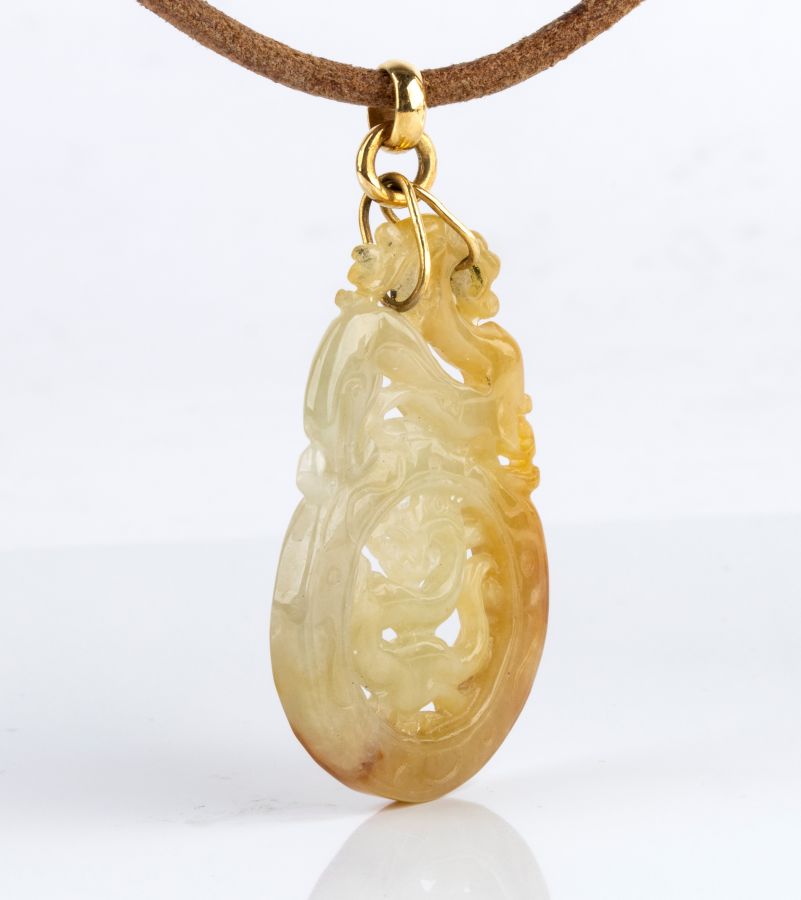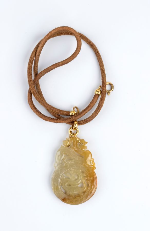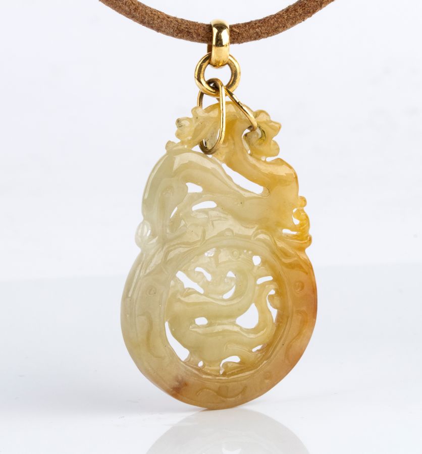 lastra in giada traforata a motivi tradizionali dell'arte orientale, raffigurante il drago cinese, con gancio di raccordo e gancio chiusura del cordoncino in oro giallo 18k.