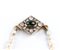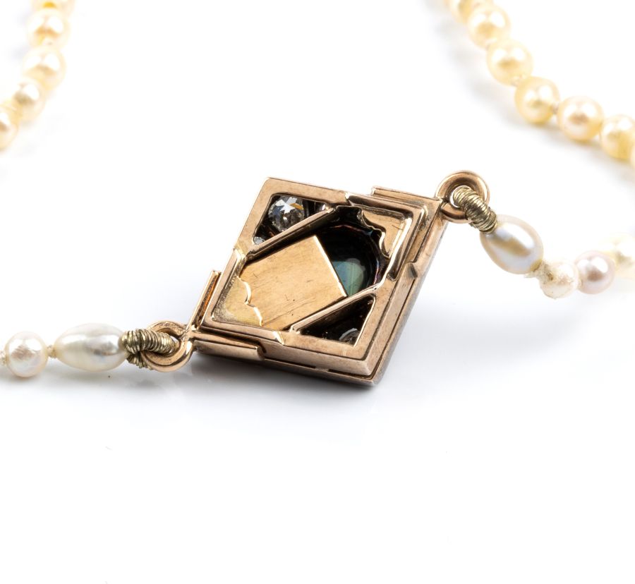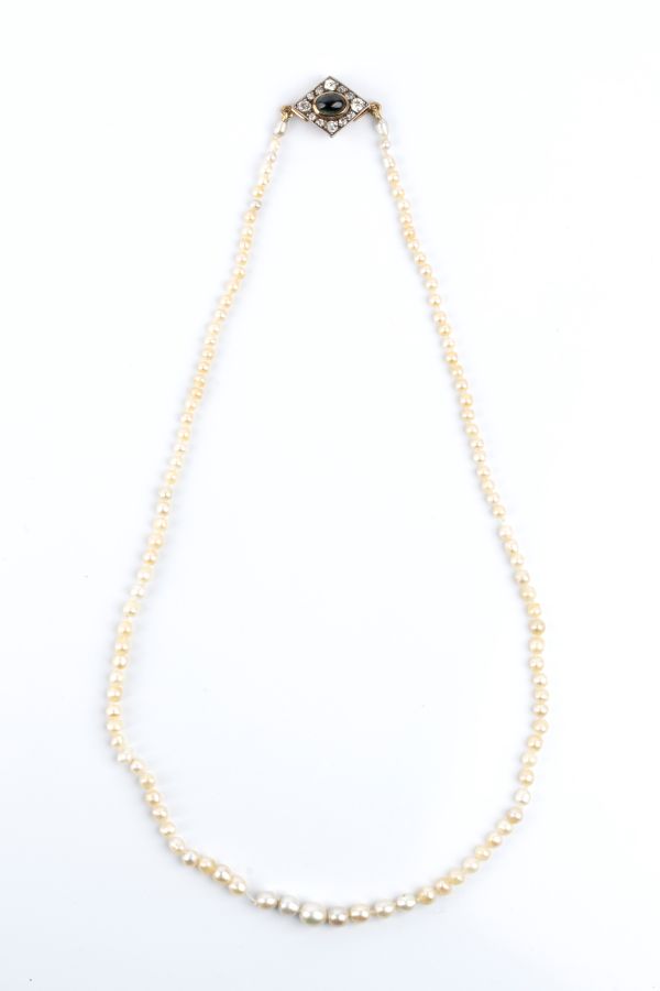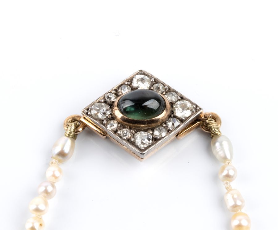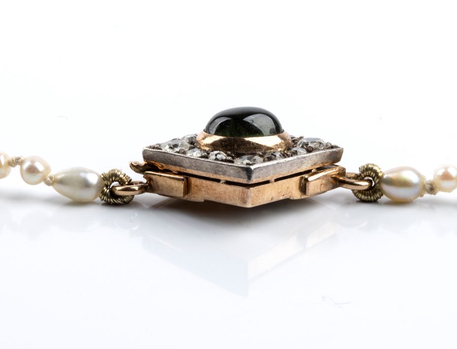 un filo di perle coltivate d'acqua dolce disposte in gradazione, con fermezza in oro ed argento a forma di rombo impreziosita una tormalina cabochon e da 12 diamanti taglio vecchia miniera, per un totale di circa 1.00 ct,