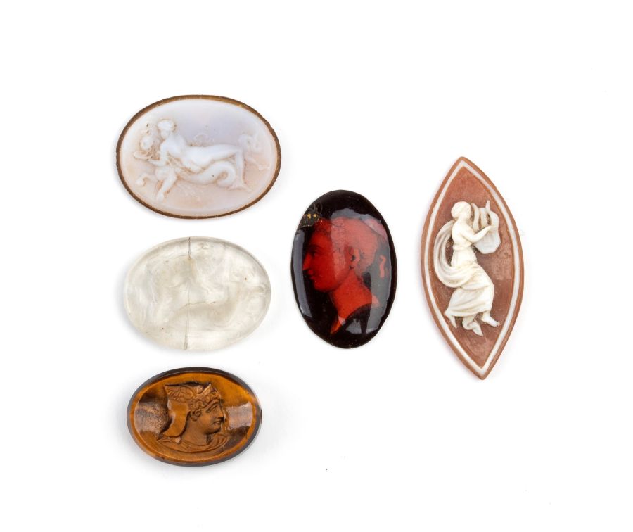 Lotto di 5 intagli in agata, calcedonio, occhio di tigre XIX-XX secolo