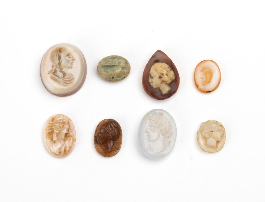 Lotto di 8 intagli in calcedonio, agata e corniola XVIII-XIX secolo