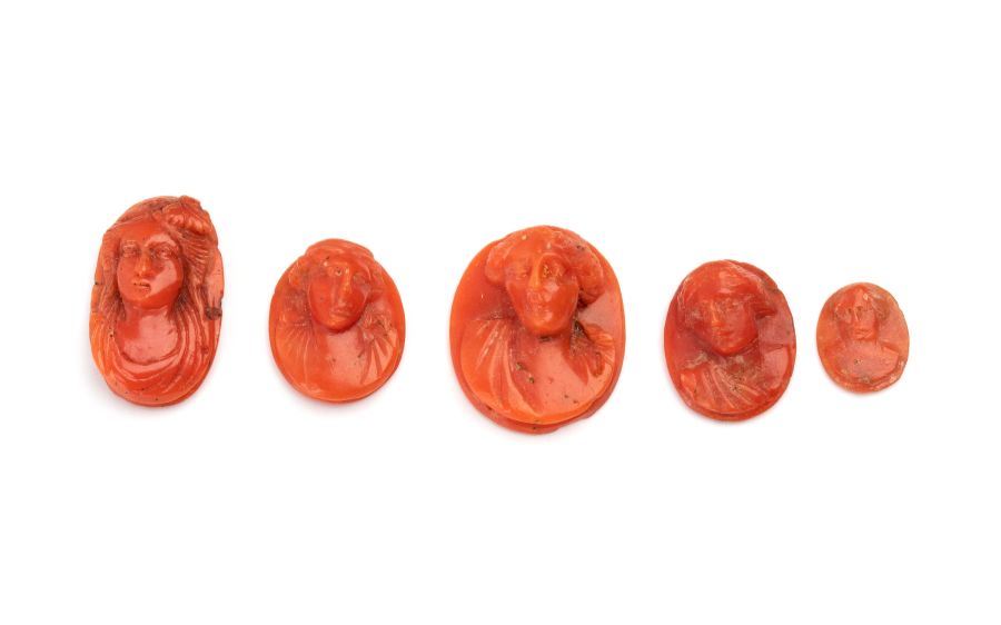 corallo rosso del Mediterraneo (Corallum Rubrum), raffiguranti cinque volti femminili ispirati alle raffigurazioni classiche.