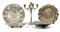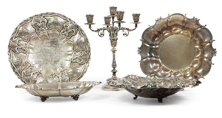 Un candelabro a cinque fuochi; un'alzata di forma ovale poggiante su quattro piedini; due centrotavola sbalzati a motivi floreali, di cui uno con pietre verdi poggianti su tre piedini; un piatto bombato