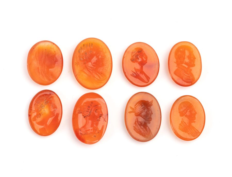 Soggetti vari: due busti panneggiati di giovane donna; un busto di donna con capelli raccolti; un busto di giovane laureato; due busti panneggiati di uomini con copricapo; un busto panneggiato di filosofo; un busto di uomini in abiti moderni.