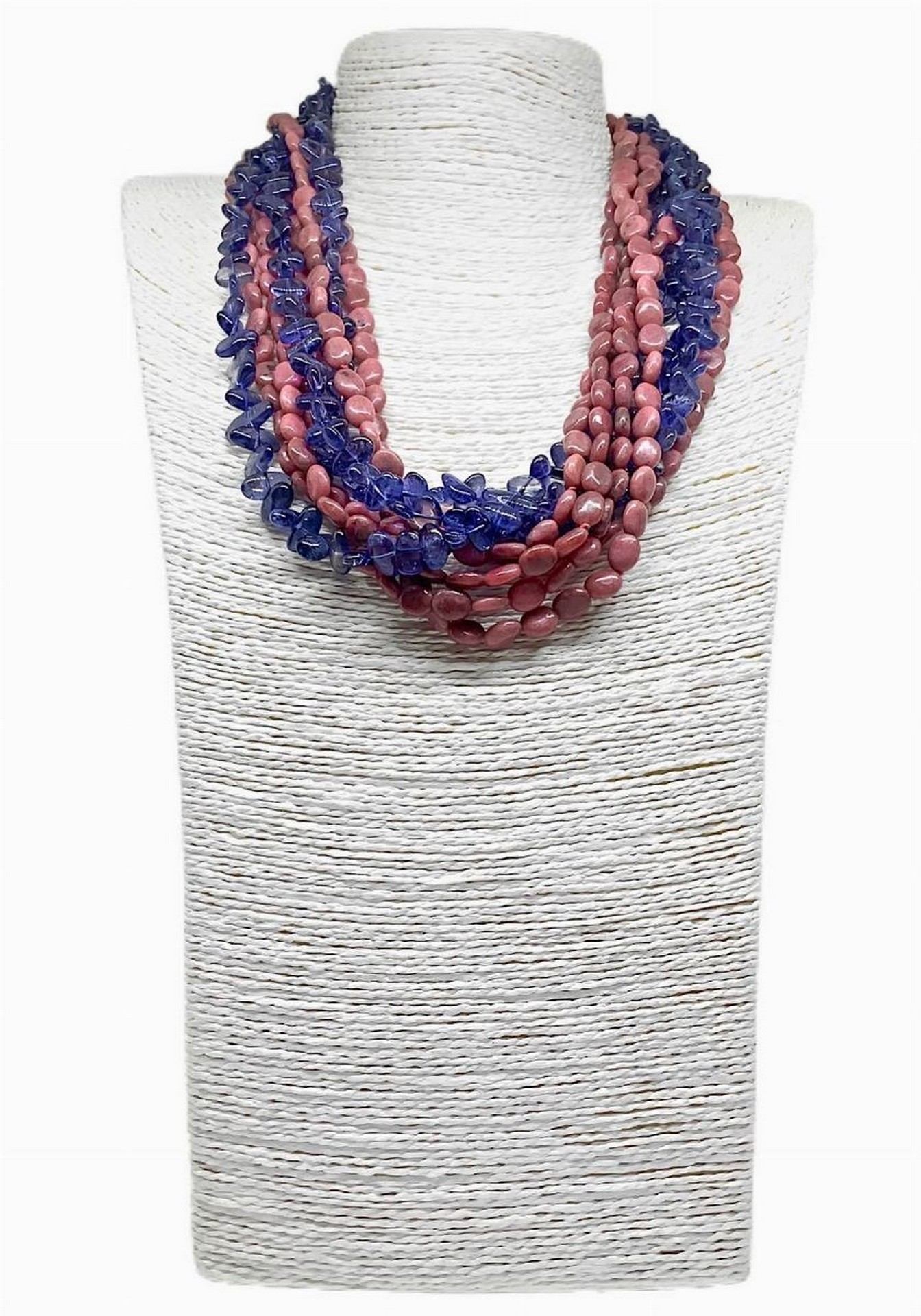 Collana a più fili composta da 5 fili di rodonite ovalino e 3 fili di iolite ovalino lunghezza totale cm 53