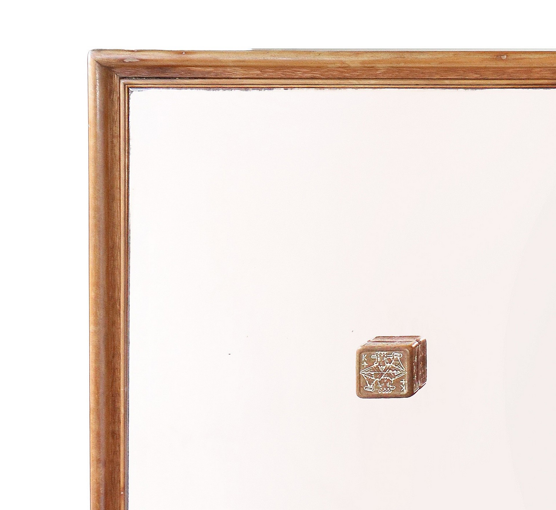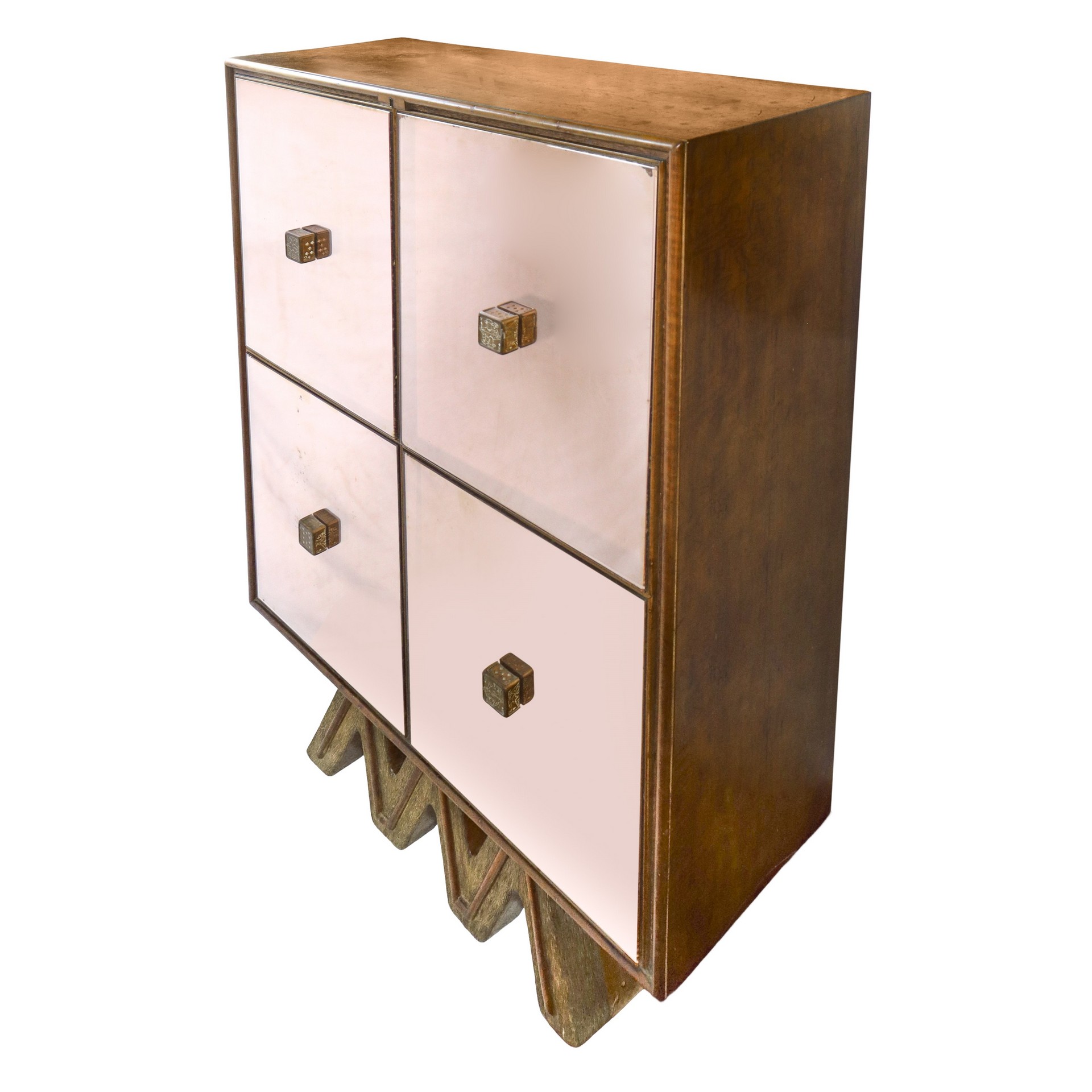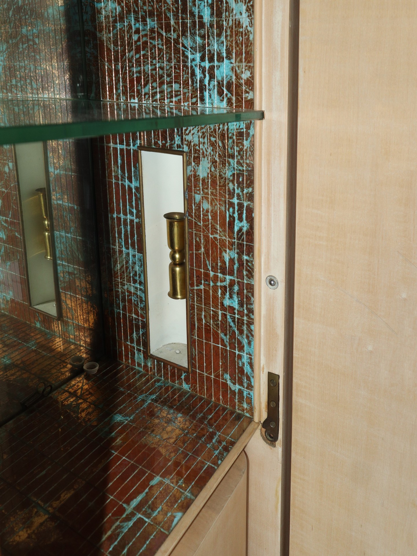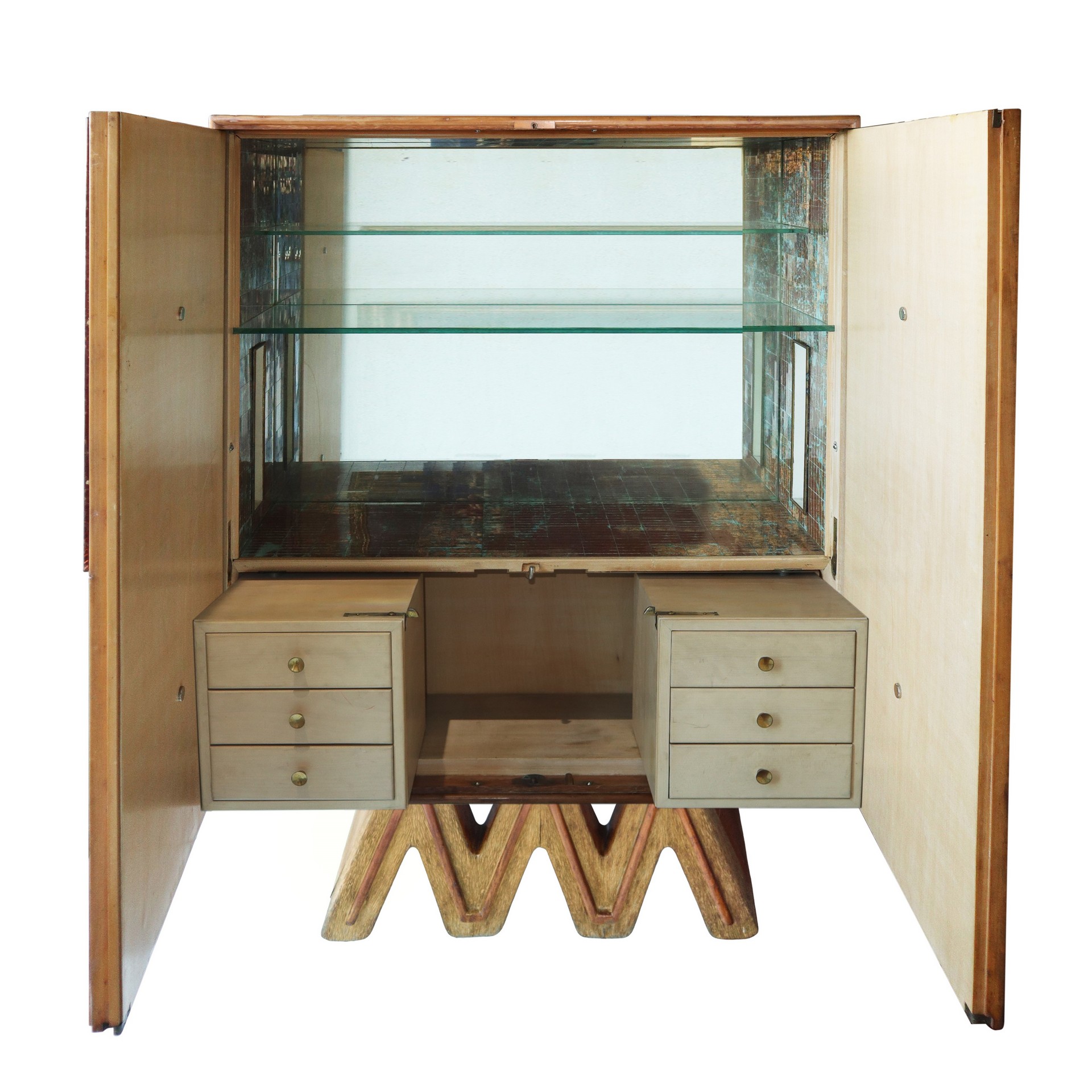 Osvaldo Borsani - Variante del mobile bar "5142" di Osvaldo Borsani per Arredamenti Borsani, Art Deco, 1939 h cm 138X100X38 Pezzo unico realizzato su commissione. Ispirato al modello "5142" e realizzato interamente a mano, questo mobile si appoggia elegantemente su una base a onda Decò intagliata in legno, mostrando una raffinatezza senza tempo. Il dettaglio dei quattro semi delle carte da gioco su ogni manico aggiunge un tocco di personalità. Le superfici in vetro e specchio, l'interno con strisce verticali di mosaico dorato e verde, la struttura in mogano lucido. Illuminazione interna (da revisionare). Segni del tempo