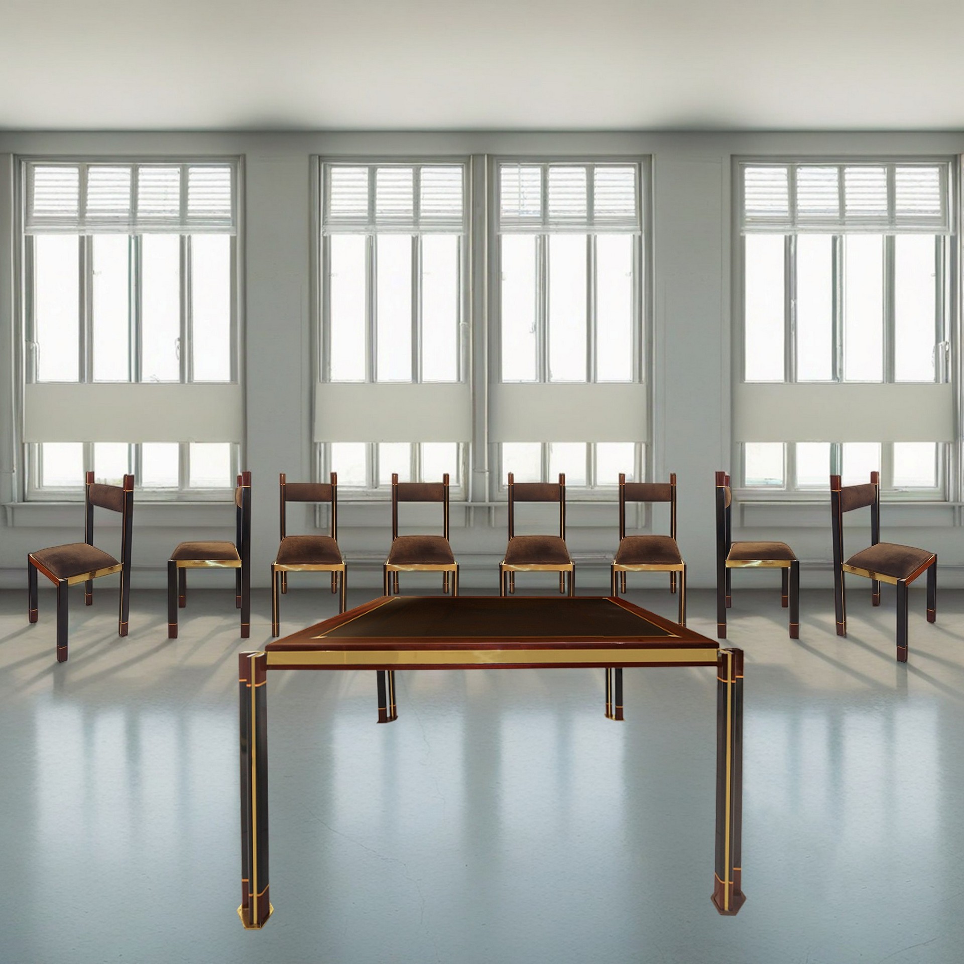 Paolo Barracchia per Roman Decò - Tavolo quadrato e 8 sedie in ottone impiallacciato in mogano e padouk con intarsi in legno d'acero, 70s