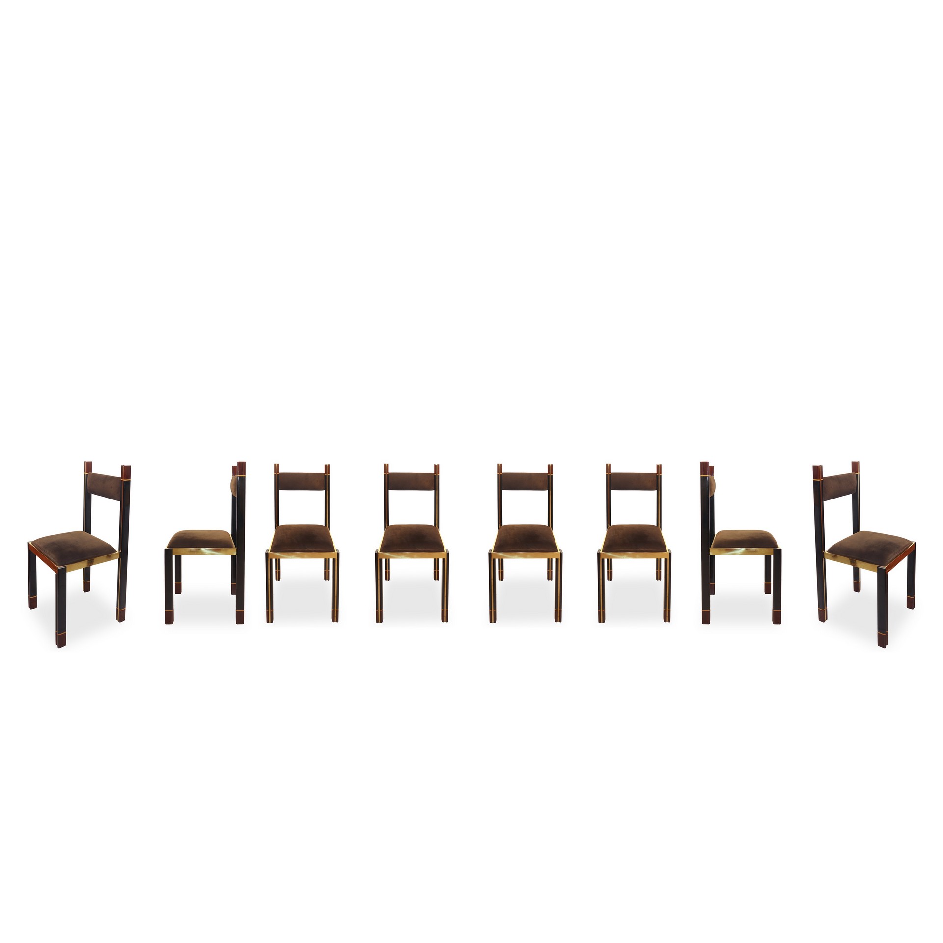 Lotto 48 | Paolo Barracchia per Roman Decò - Tavolo quadrato e 8 sedie in ottone impiallacciato in mogano e padouk con intarsi in legno d'acero, 70s