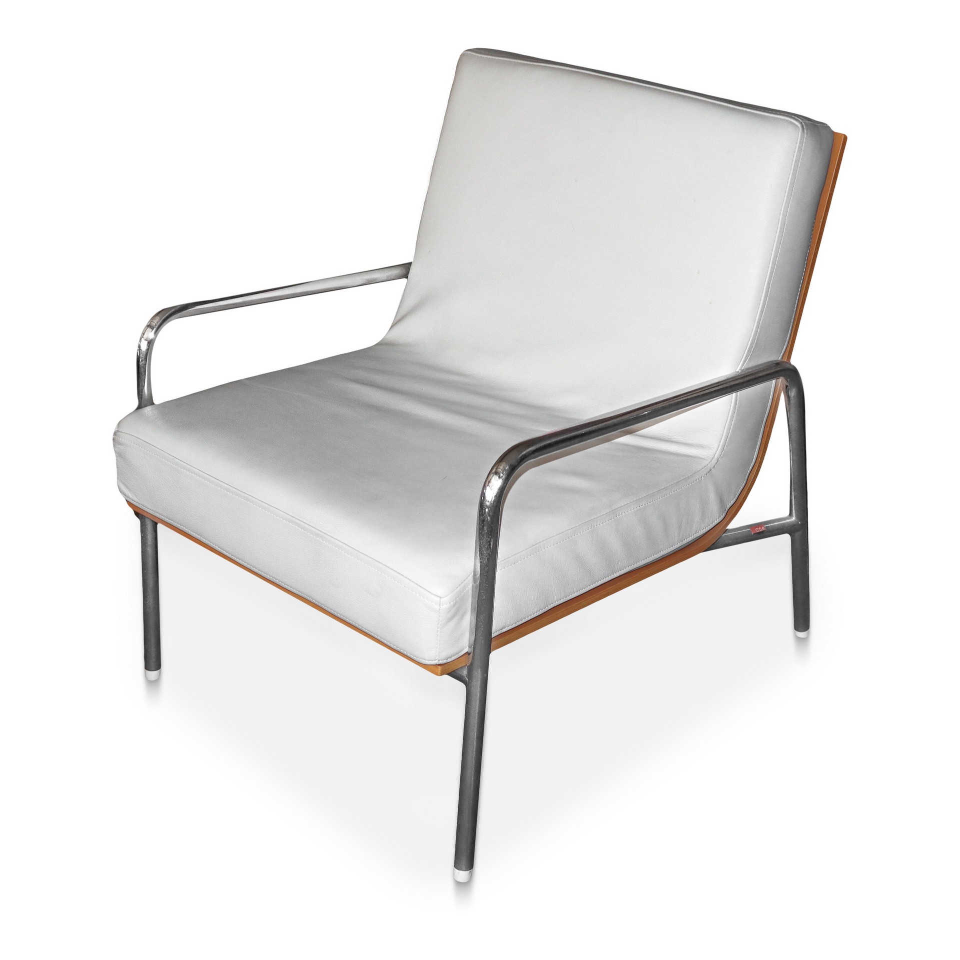 Poltrona prod. italiana Alivar con struttura cromata e tappezzeria in pelle bianca e schienale di sostegno in legno chiaro