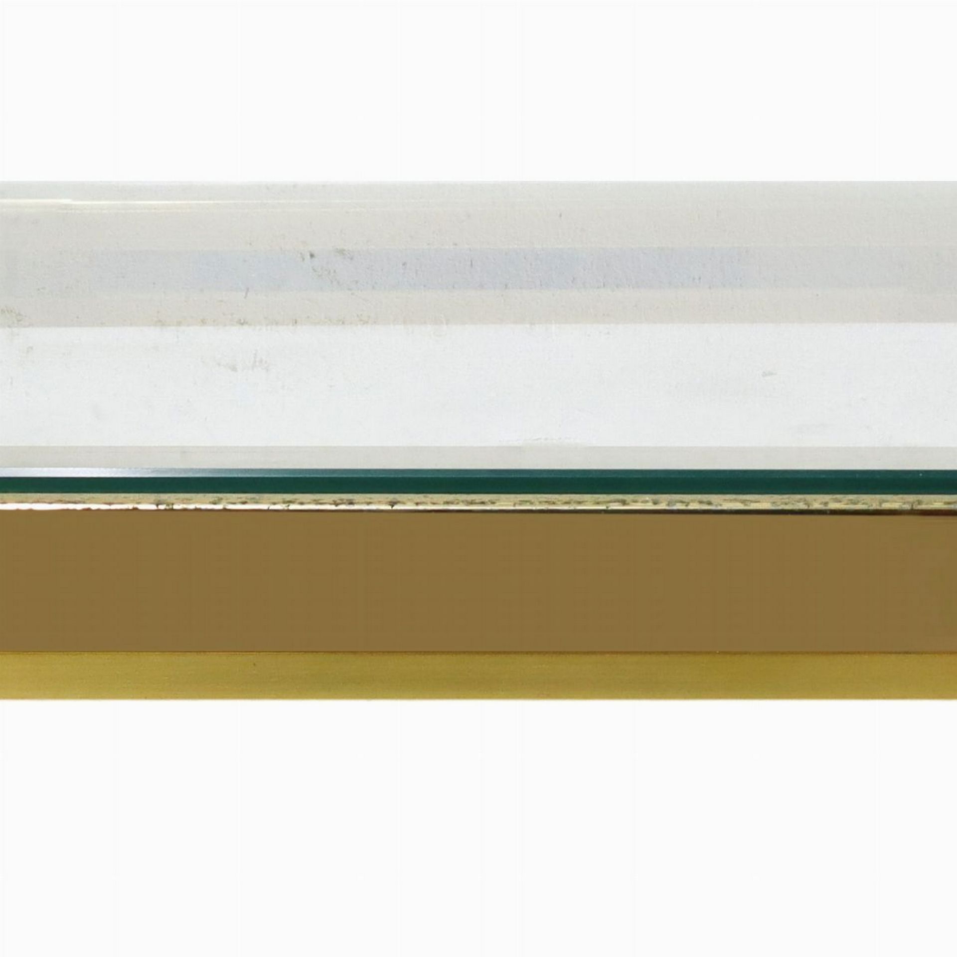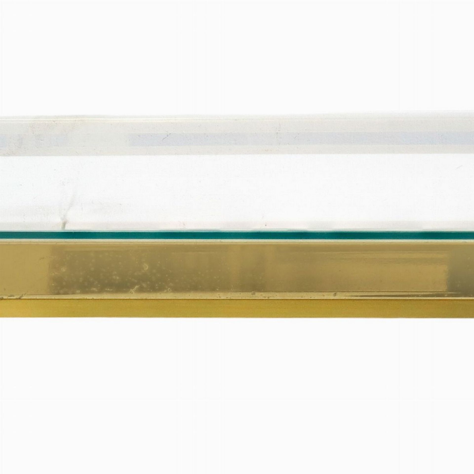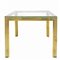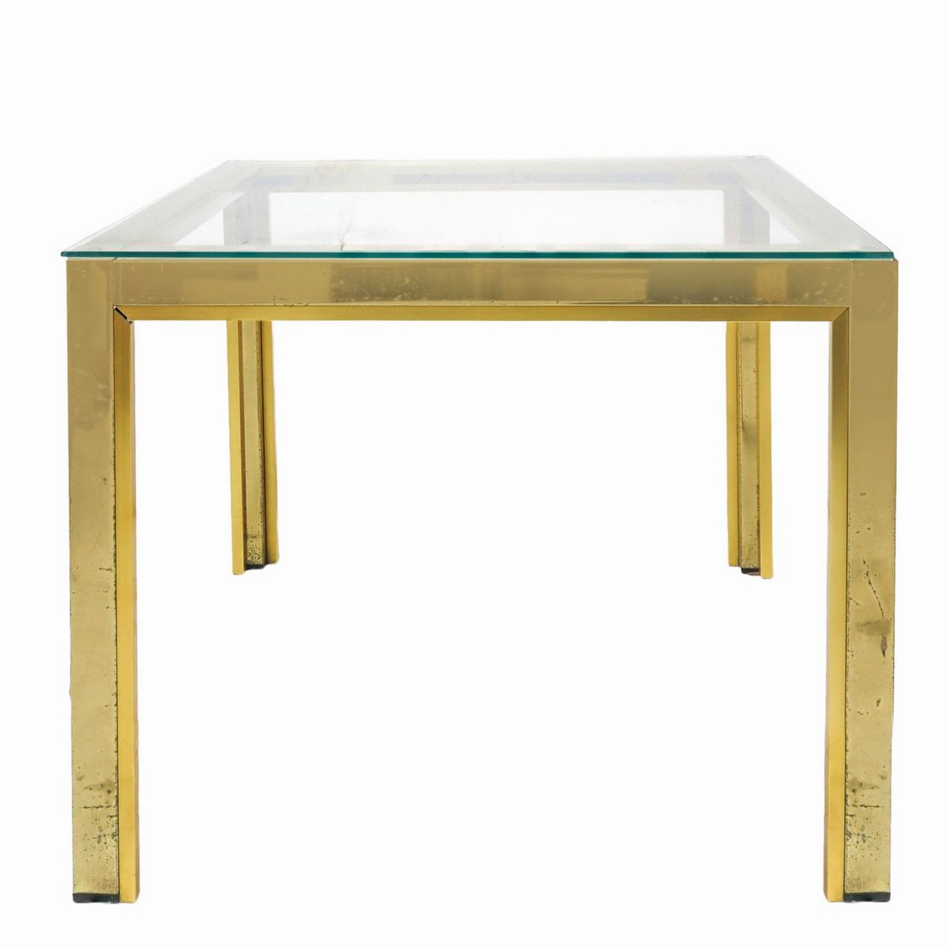 Coppia di tavolini H cm 50,5, cm 60x60, piccolo H cm 37,5, 46x46 Struttura in ottone dorato, piano in vetro color. Presenti segni d’uso.