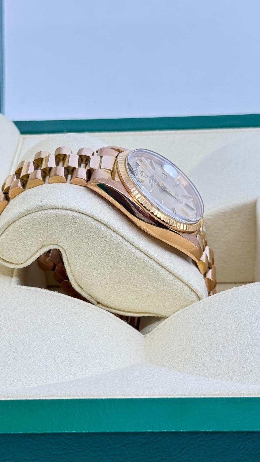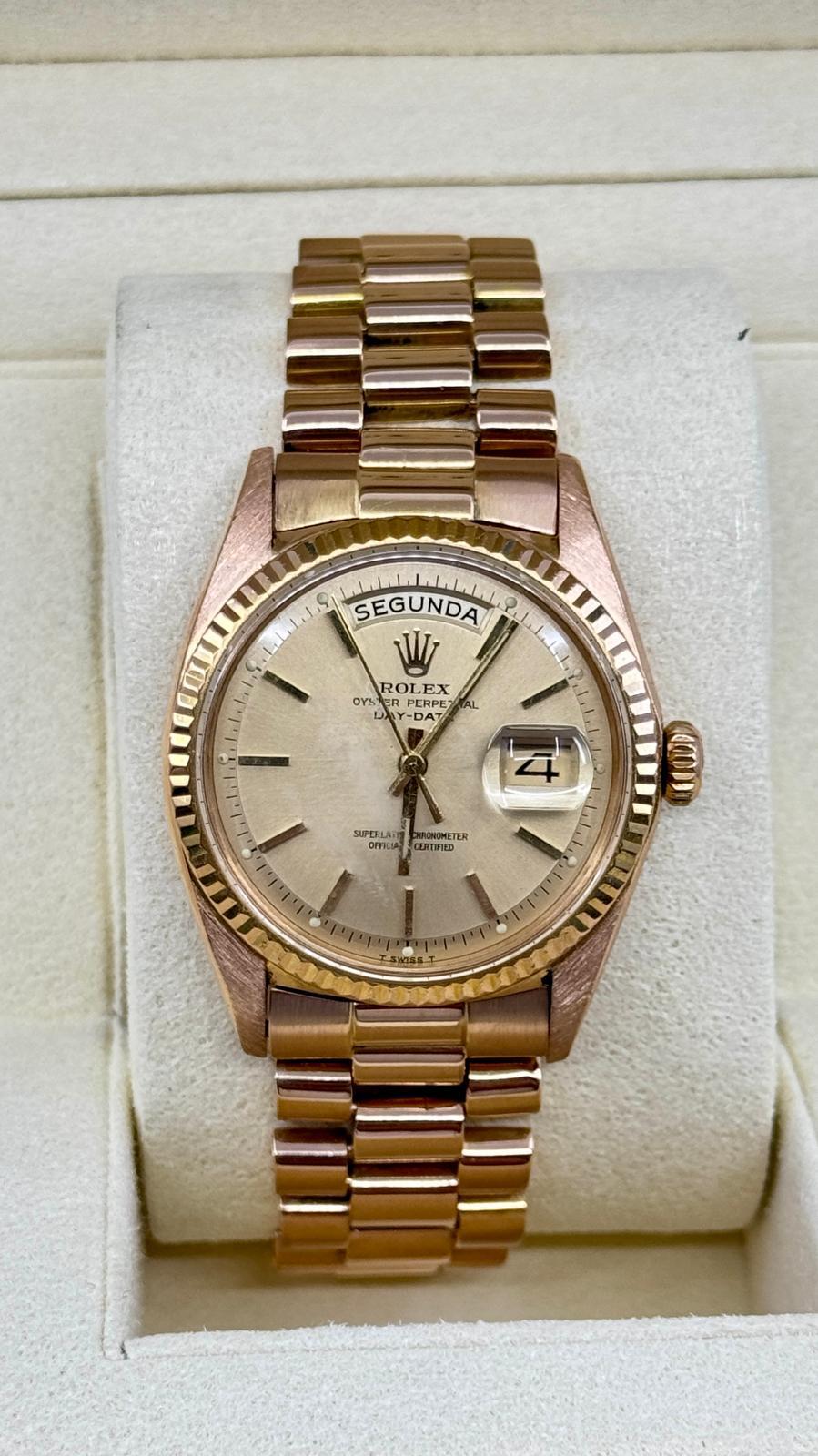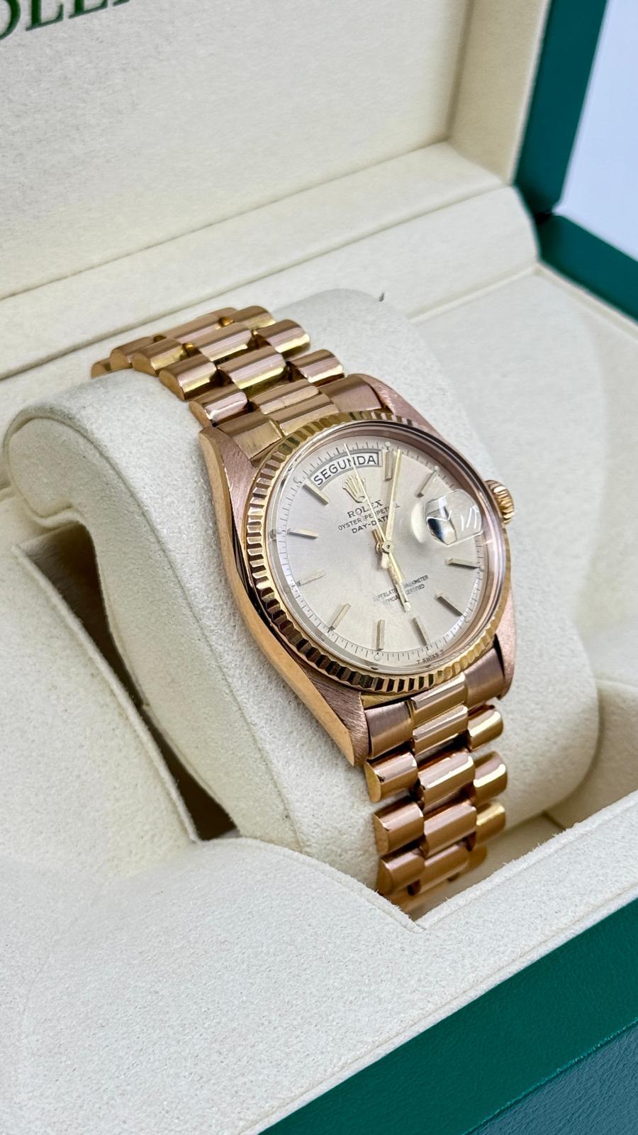 Marca Rolex Modello (Orologio) Day-Date 36 Numero di referenza 1803 Carica Automatico Materiale della cassa Oro giallo Materiale cinturino Oro giallo Fine anno 60 Condizione Usato (Ottimo) L'articolo presenta segni di usura lievi, come ad esempio graffi leggeri, ma non percepibili al tatto. Corredo Senza scatola e documenti, revisione da laboratorio interna effettuata nel 2025 Carica Automatico Cassa Materiale della cassa Oro giallo Diametro 36 mm Impermeabile 10 ATM Materiale lunetta Oro giallo Vetro Vetro plexi Cinturino Materiale cinturino Oro giallo Colore cinturino Oro Materiale chiusura Oro giallo - COMMISSIONE D’ASTA 25%