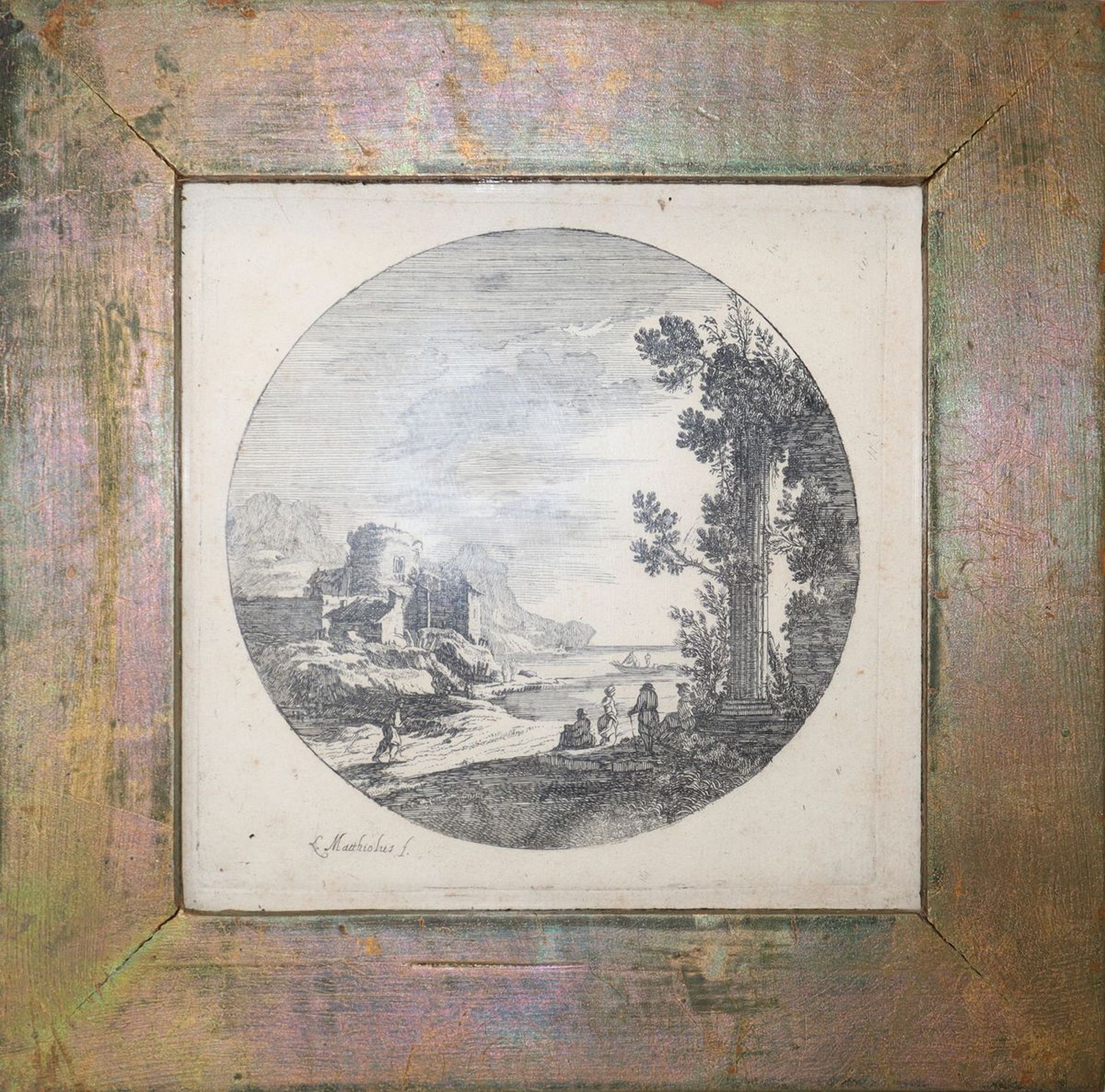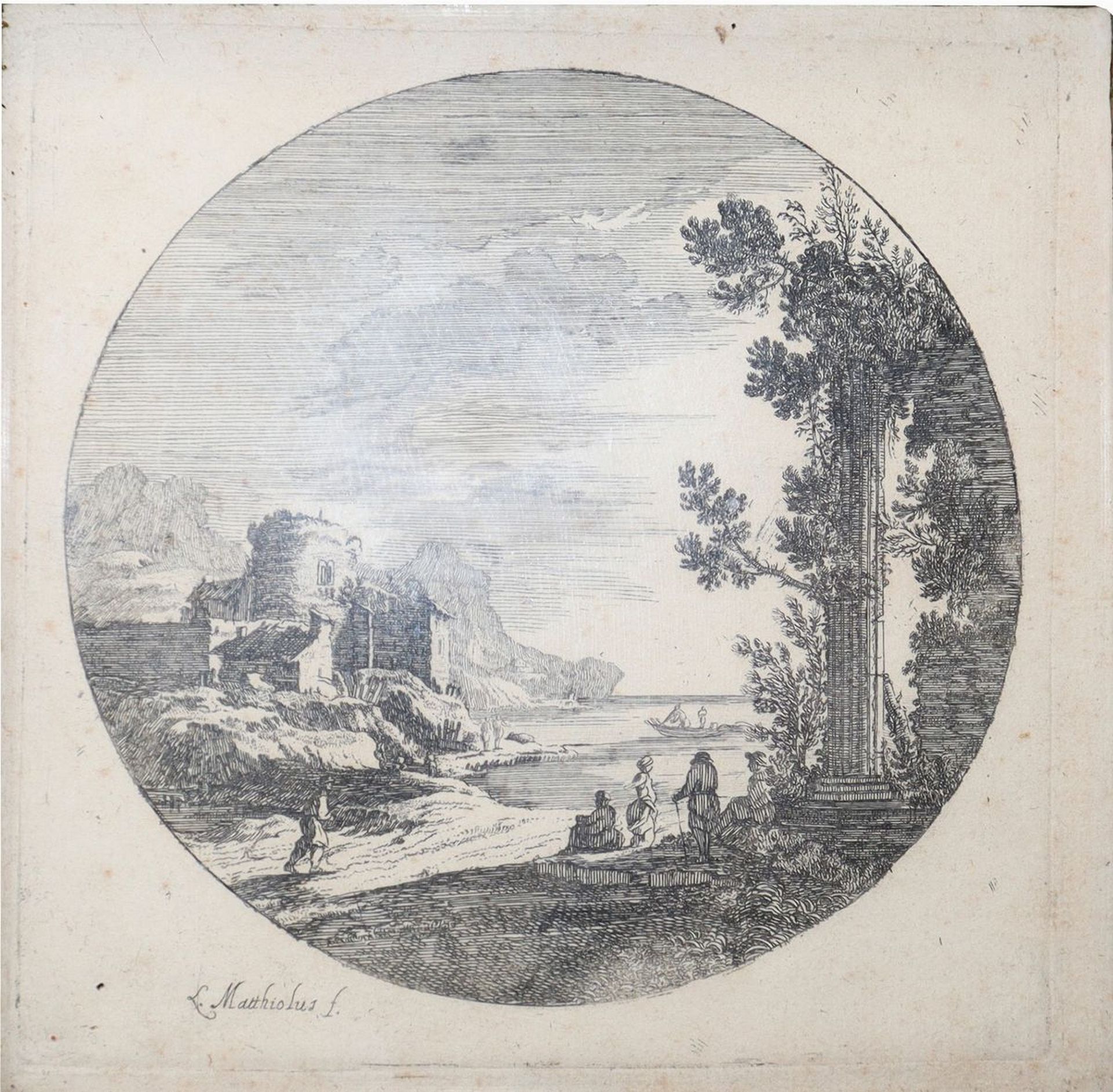 Ludovico Mattioli (Crevalcore 1662 - Bologna 1747) - Paesaggio con ruderi, personaggi in riva al mare H mm 162 x 162 / in cornice 24 x 24 Incisione all'acquaforte Firmato in basso a sinistra