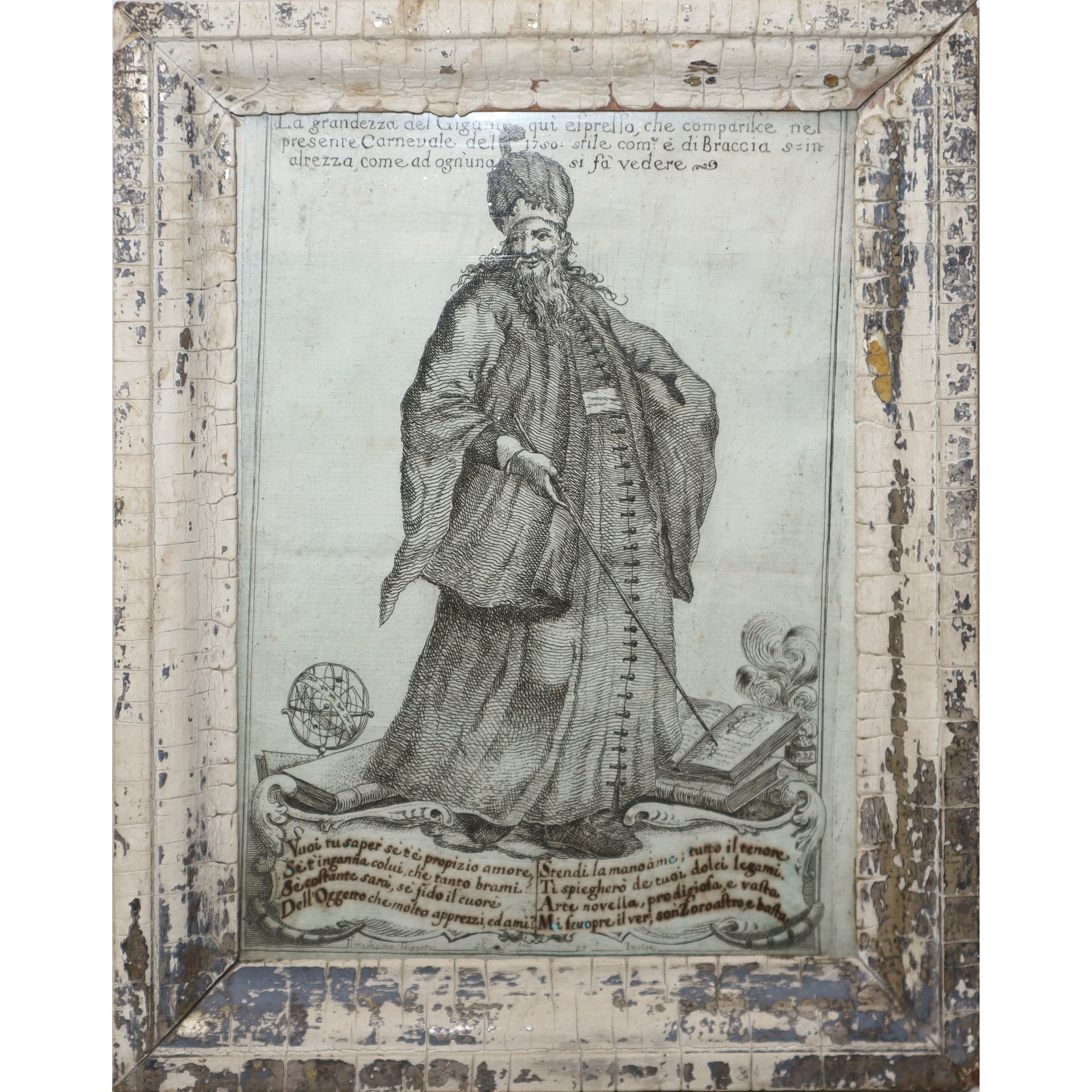 N°2 incisioni, La grandezza del gigante comparso nel carnevale del 1750 e ovale Madonna con bambino, 18° secolo Gigante MM 220 x 157 in cornice cm 26 x 20, Madonna MM 120 x 150 in cornice dorata e laccata cm 15 x 18 Incisione all'acquaforte su carta vergata