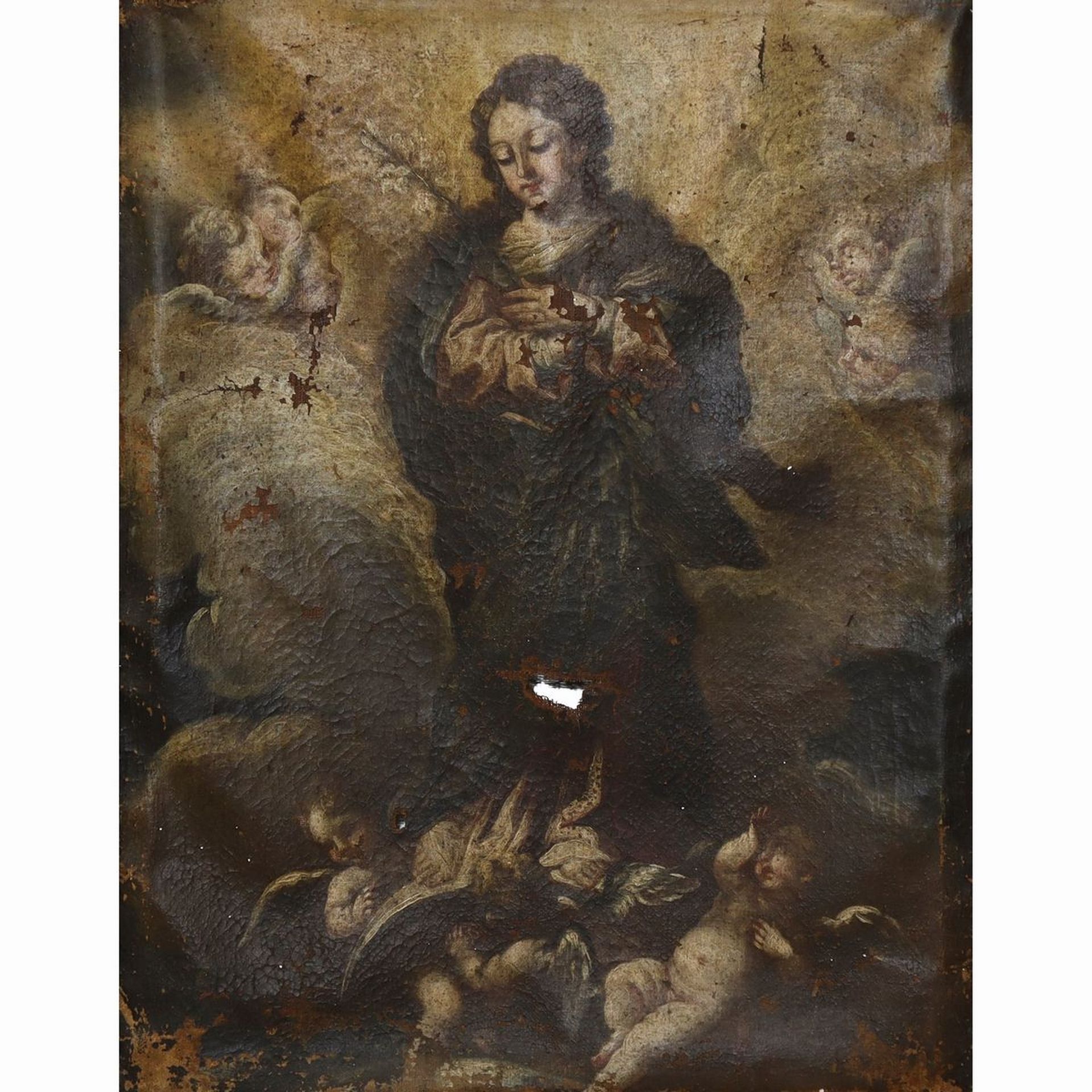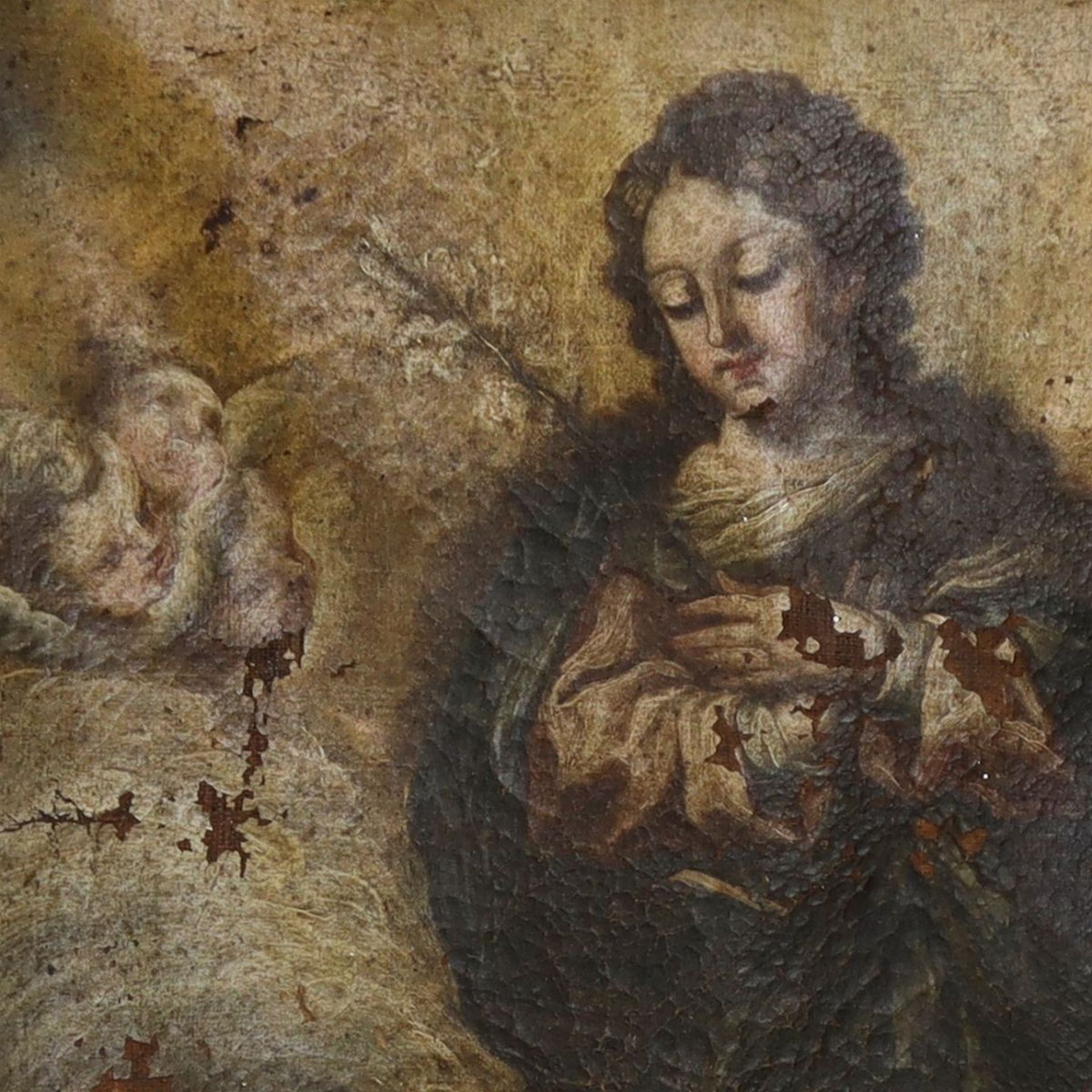 Immacolata concezione , 18° secolo cm 46x35,5 in cornice cm 53x42 Da restaurare. Presenti buchi e cadute di colore.
