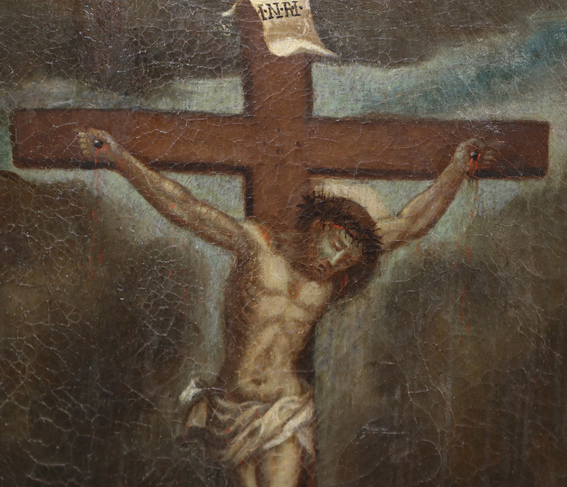 Gesù Cristo in croce con le anime purganti alla base, 18° secolo painter H cm 53x41 - in cornice H cm 70x57 Olio su tela