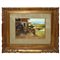 Borgo con case e personaggi h cm 19,5X25 in cornice h cm 28,5X43,5 Olio su tavola Cornice in legno dorata intagliata. Firmato in basso a destra R.