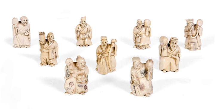 Lotto composto da nove netzuchè in avorio, raffiguranti personaggi orientali