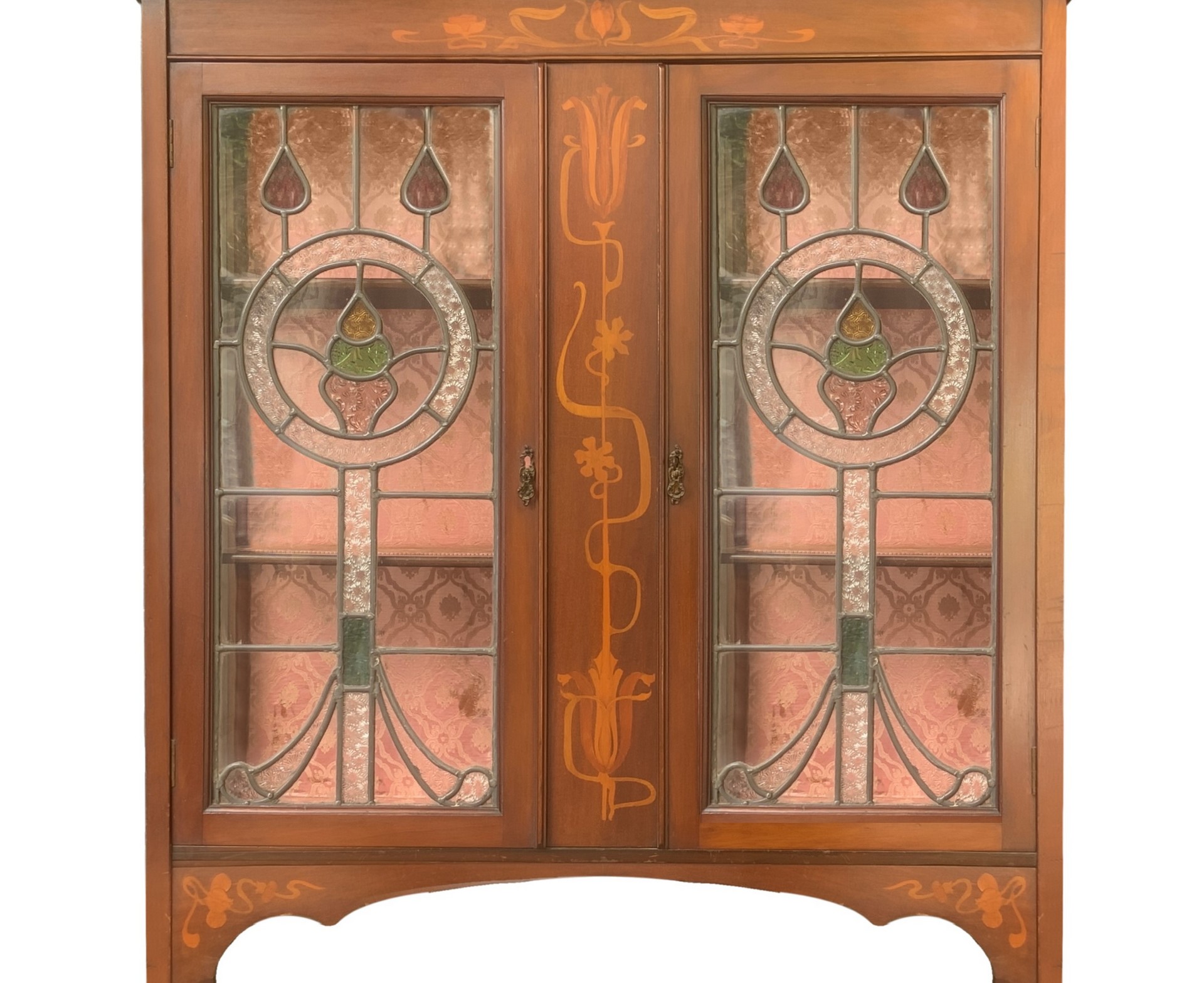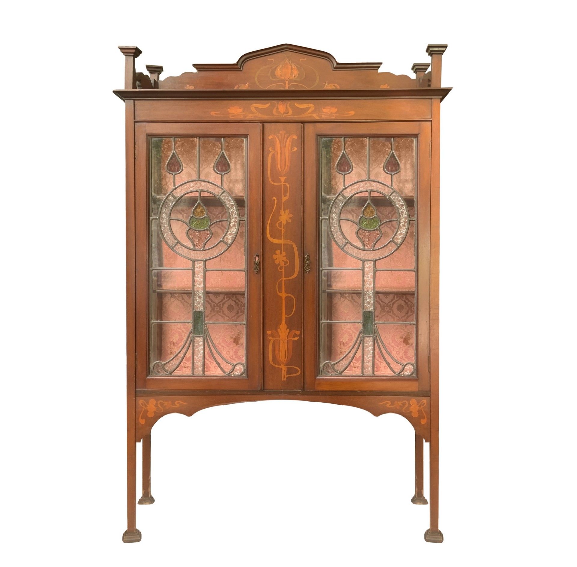 Mobile vetrina bassa Liberty , Early 20° secolo H 168x100x35 cm con ante in vetro piombato policromo.