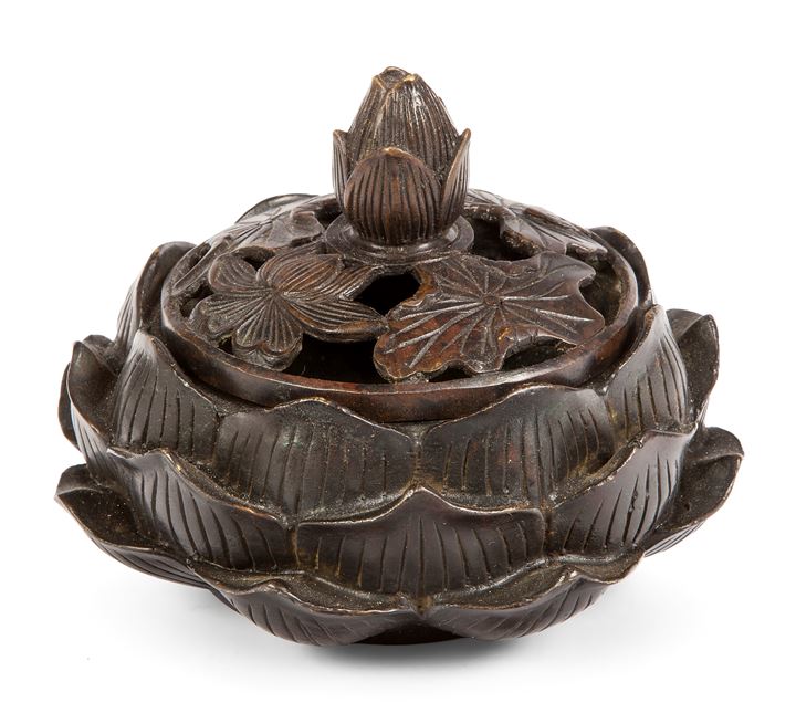 INCENSIERE H. cm 9, diam. 13 In bronzo, Cina XIX secolo, a forma di fiore di...