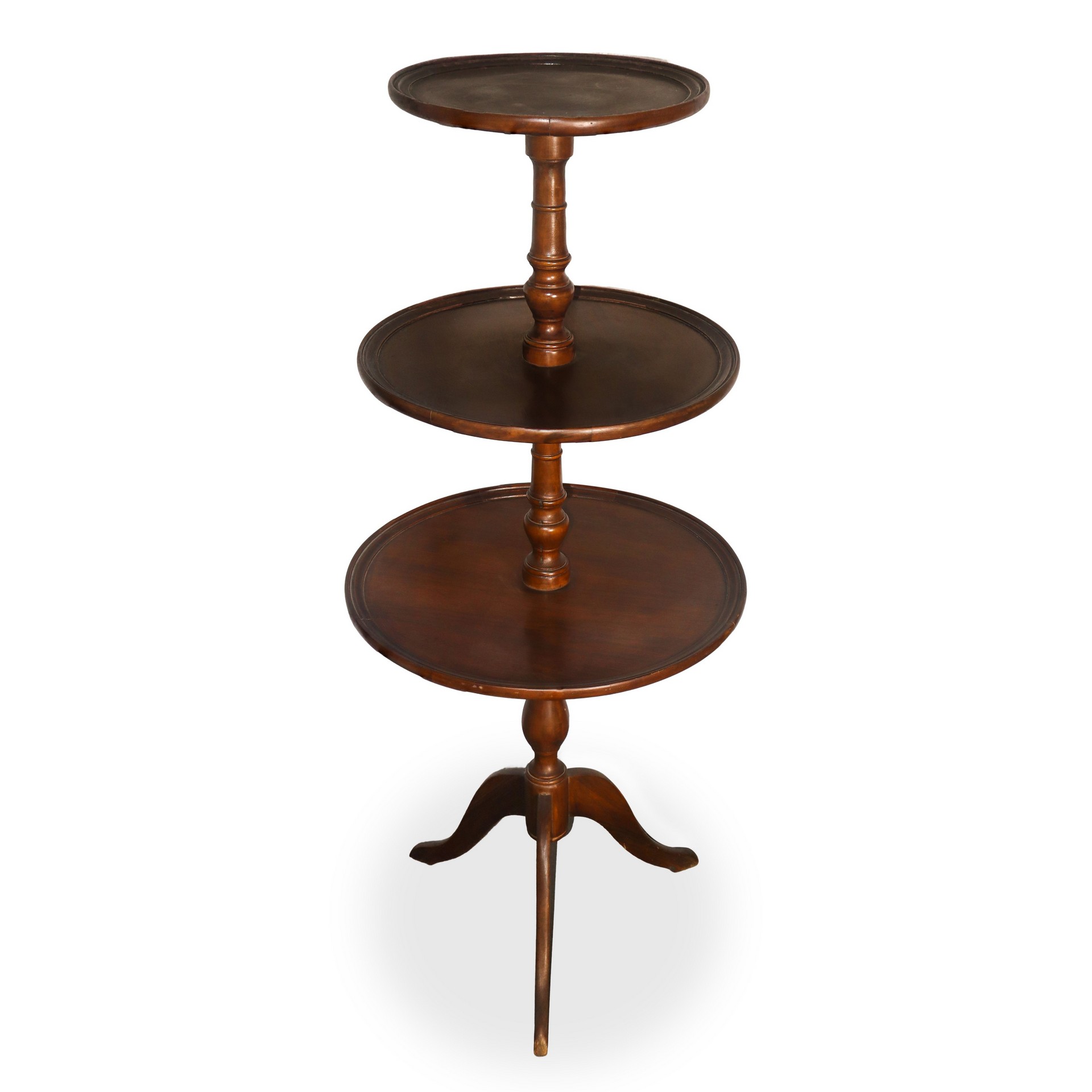 Servitore muto a tre ripiani rotondi in legno di noce piede a tre razze fusto di dostegno a rocchetto , 19° secolo