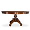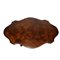 Tavolo basso a biscotto piano in radica di noce filettato con legni chiari piede a boccia a quattro razze, 19° secolo